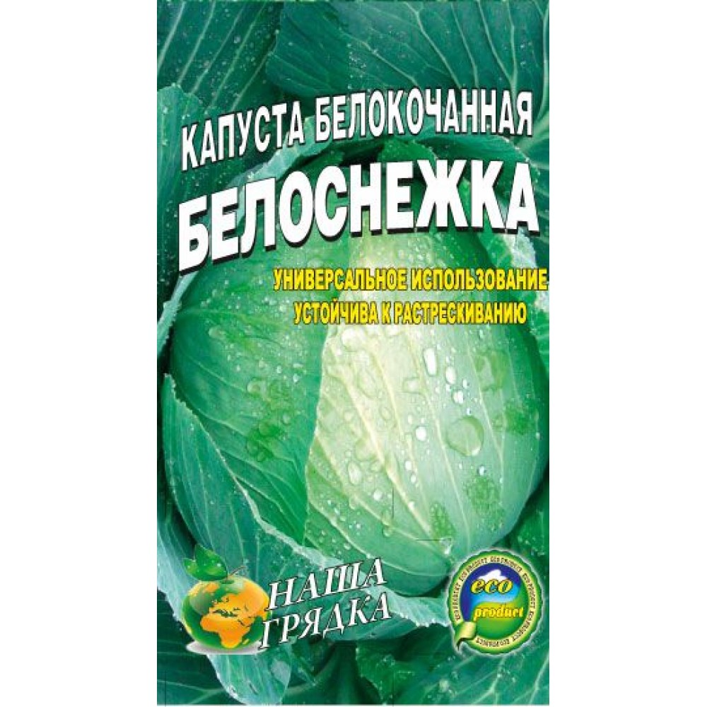 Капуста Белоснежка Сорт позднеспелый 145-160 дней. Высокоурожайный. Головки округлые и округло-плоские весом 2,5-3,9 кг, плотные, сочные, с хорошими вкусовыми качествами, окраска сечения белая. Предназначается для хранения и переработки. Качество квашеной продукции доброе. Лежкость головок при зимнем хранении высокая. Транспортабельность хорошая.