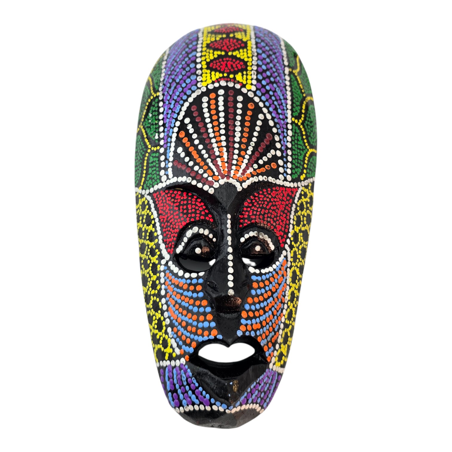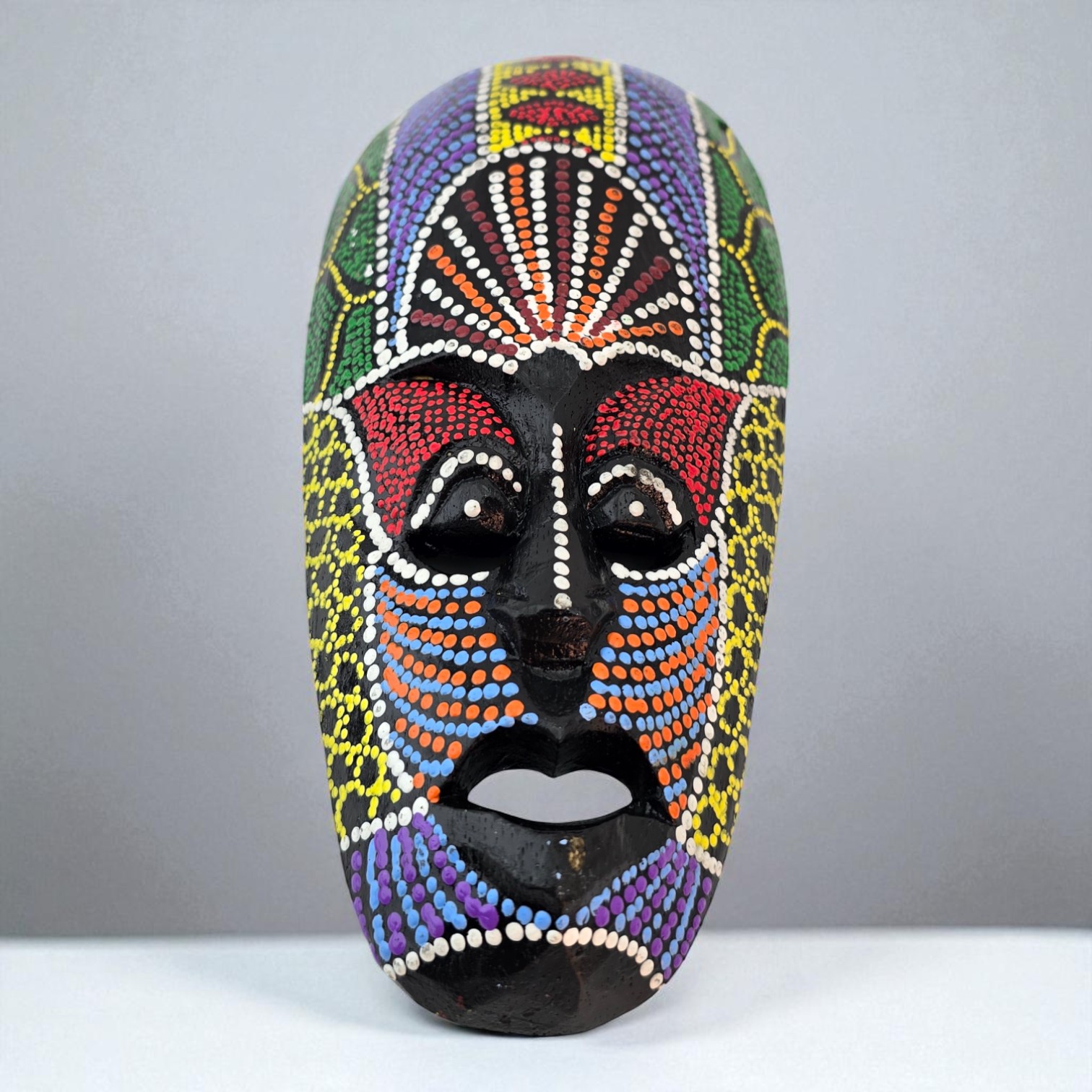 Настенная деревянная маска с яркой точечной росписью в племенном стиле. Легкая, со шнурком для подвеса на обратной стороне, подходит для декора гостиной, студии, кафе и фотозоны. Хорошо сочетается с этническими, бохо и тропическими интерьерами и работает как акцент в композициях с панно и другими масками.