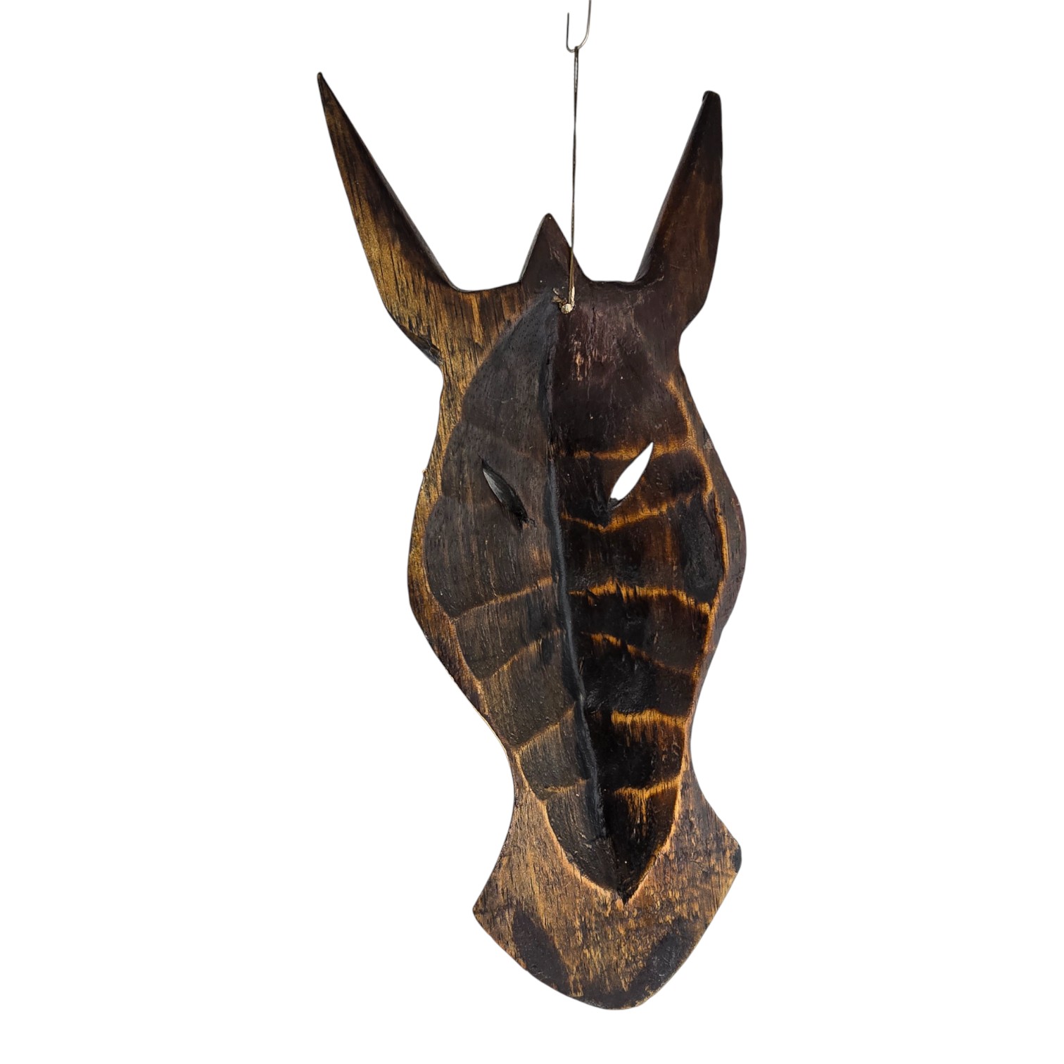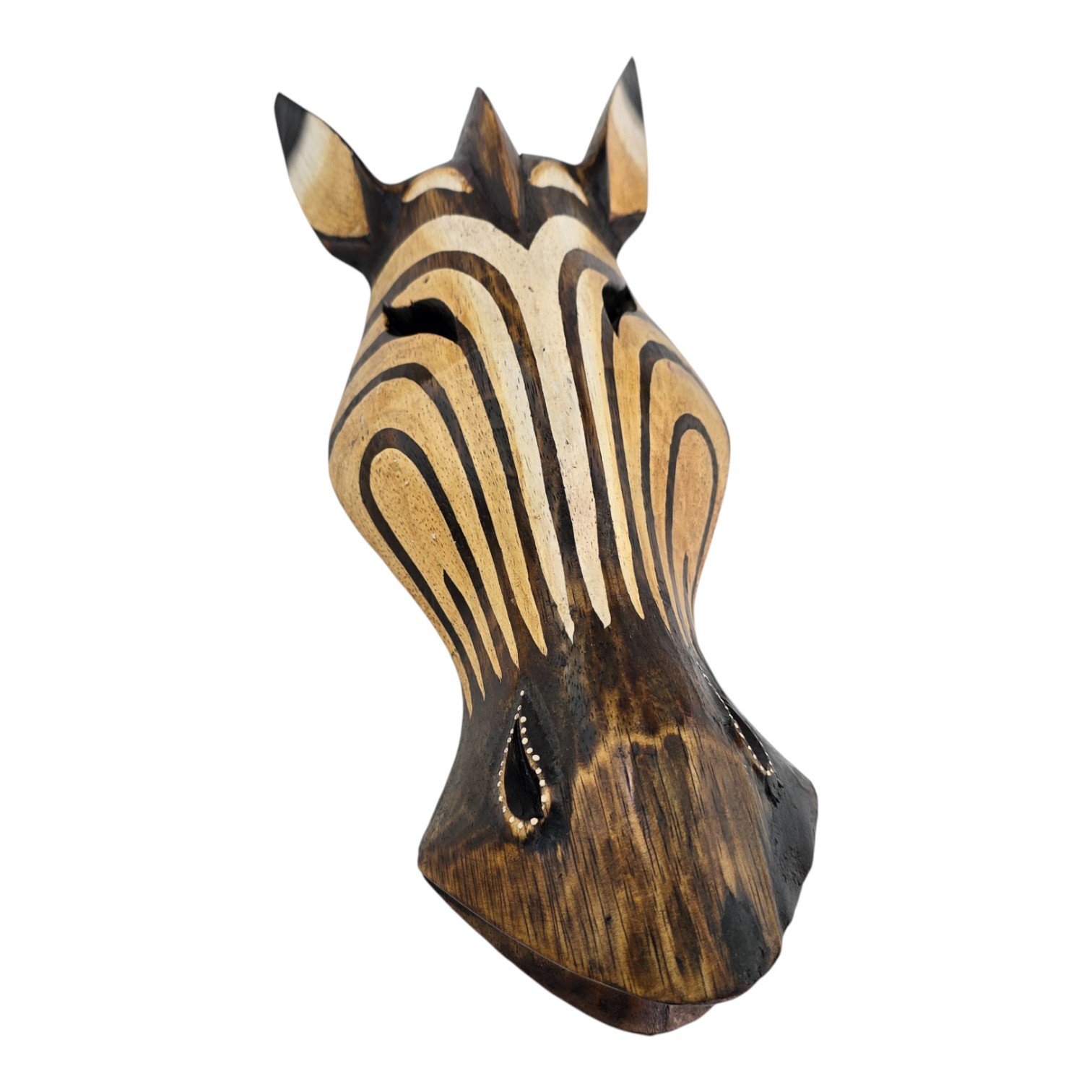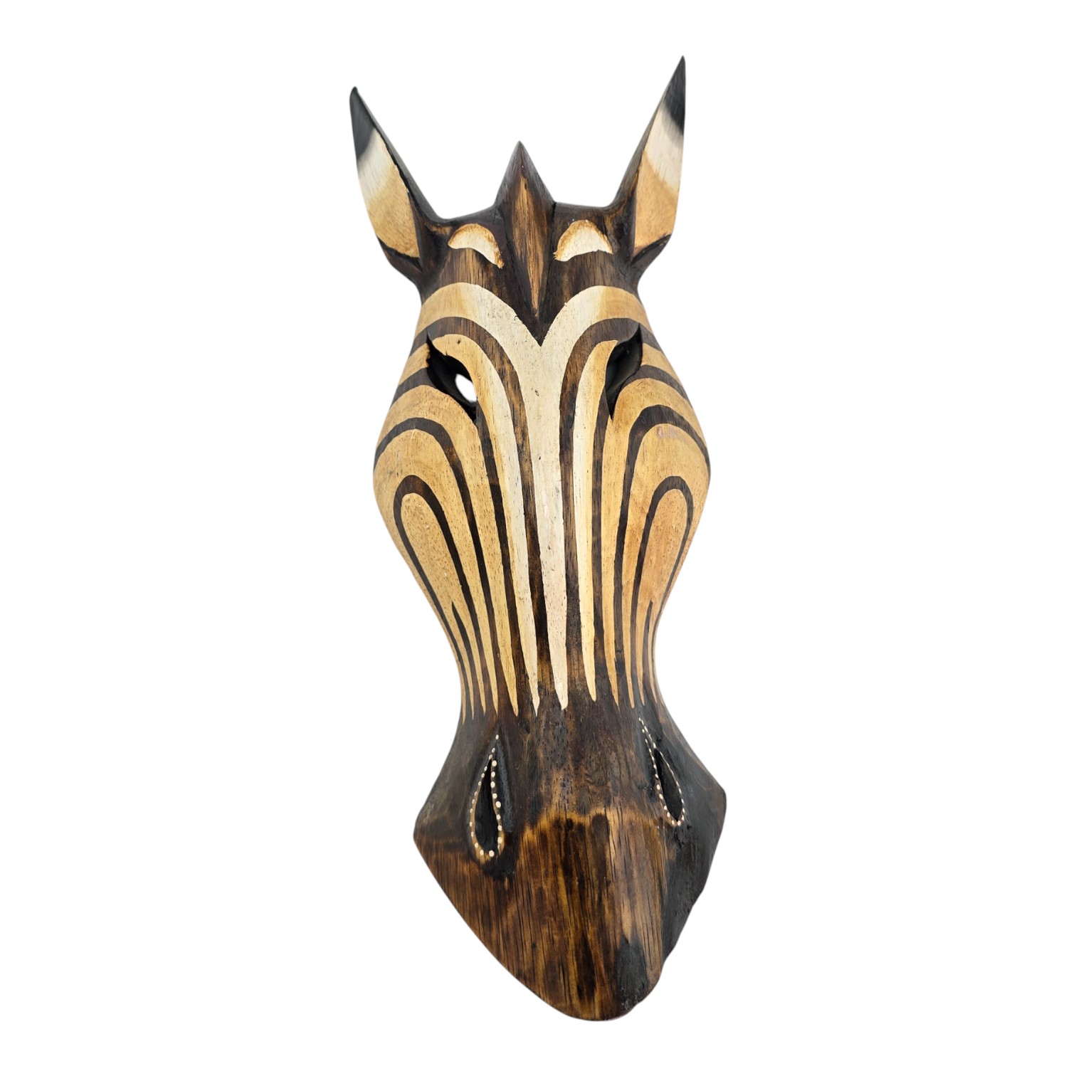 Настенная маска в виде головы зебры привносит в интерьер африканские мотивы и уютный деревянный акцент. Светлые полосы вырезаны и подчёркнуты тёмным фоном, поэтому маска хорошо смотрится и на светлой, и на контрастной стене. Маска вырезана вручную индонезийскими мастерами, поэтому на каждом экземпляре возможны небольшие различия в оттенке и линиях резьбы. Лёгкий вес позволяет просто повесить её на гвоздь или крючок и использовать как самостоятельный акцент или часть композиции с другими этническими предметами декора.