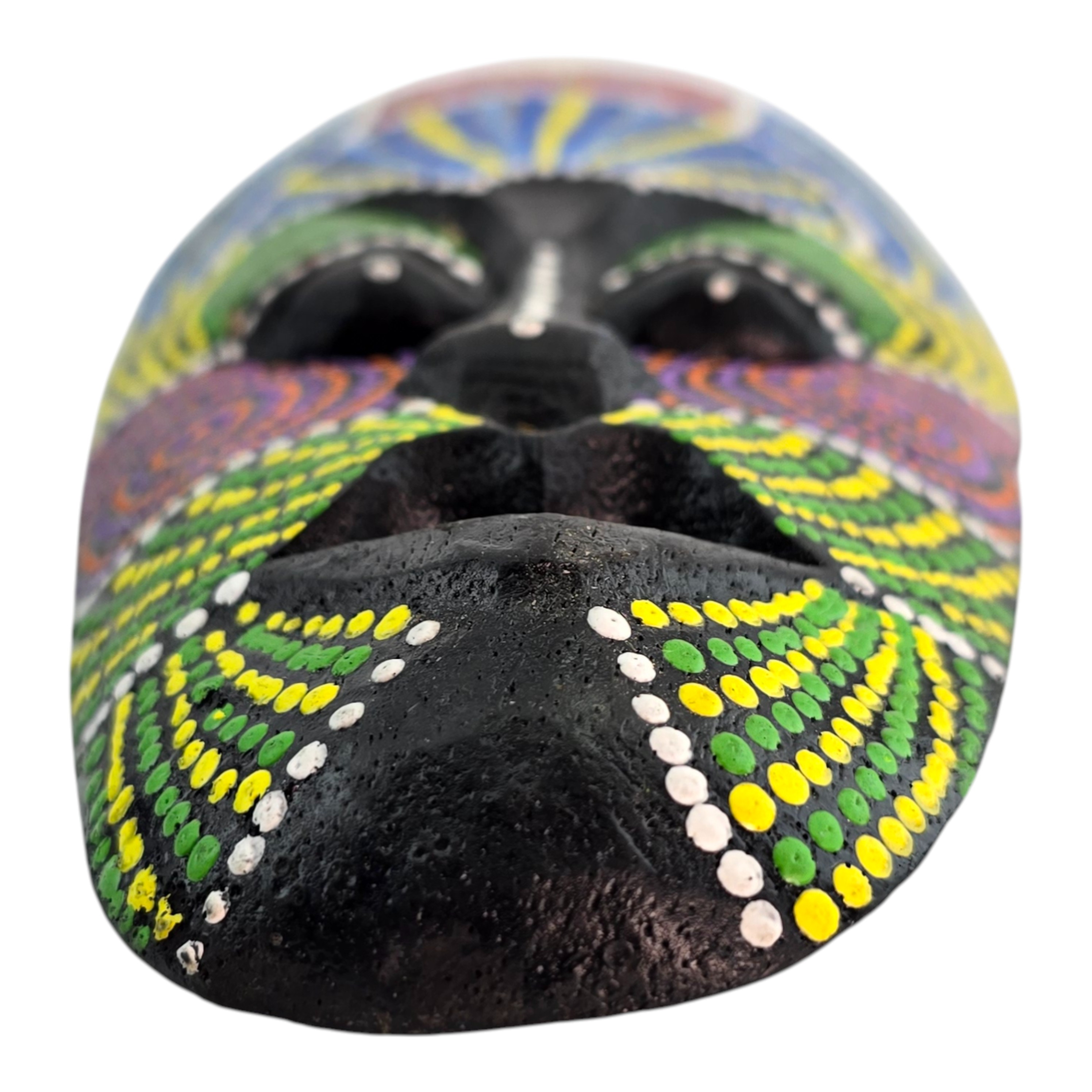 Изготовлена из натурального дерева мастерами в Индонезии. Каждая маска украшена вручную в технике точечной росписи (dot art) в традиционном африканском стиле. Яркие насыщенные цвета — красный, синий, желтый, зеленый, фиолетовый и белый — образуют уникальные узоры на глубоком чёрном фоне.