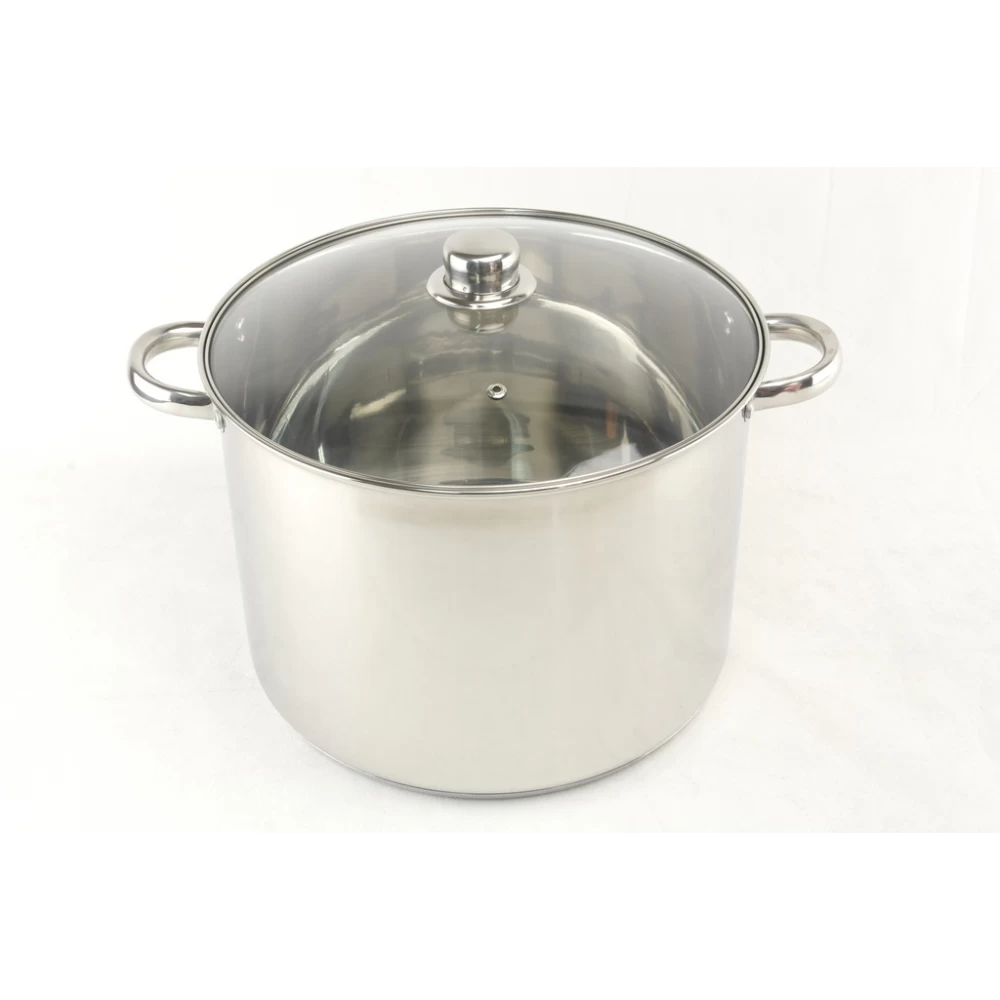 Каструля об'ємом 15,5 літрів виготовлена з нержавіючої сталі. Такий посуд відрізняється довговічністю і стійкості до хімічних реакцій, кислот і лугів. При цьому посуд, виготовлений з нержавіючої сталі, не вимагає складного відходу і миється в посудомийних машинах, має привабливий вигляд і підходить під будь-який кухонний інтер'єр будинку, ресторану, кафе. Дно каструлі капсульне, тришарове, добре розподіляє тепло по усій поверхні і дає можливість використати каструлю на плитах будь-якого типу. Кришка з термостійкого скла дозволяє контролювати процес приготування без втрати тепла. Сталеві ручки на клепковому з'єднанні зручні тим, що вони не нагріваються.