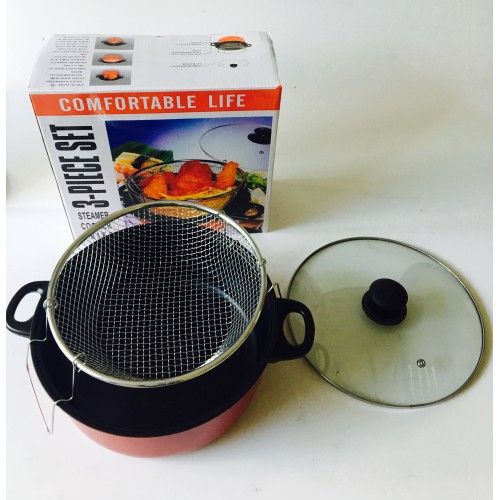 Кастрюля-фритюрница изготовлена из углеродистой стали с антипригарным покрытием. В комплект идёт сетка и термостойкая стеклянная крышка. Также можно использовать и как обычную кастрюлю