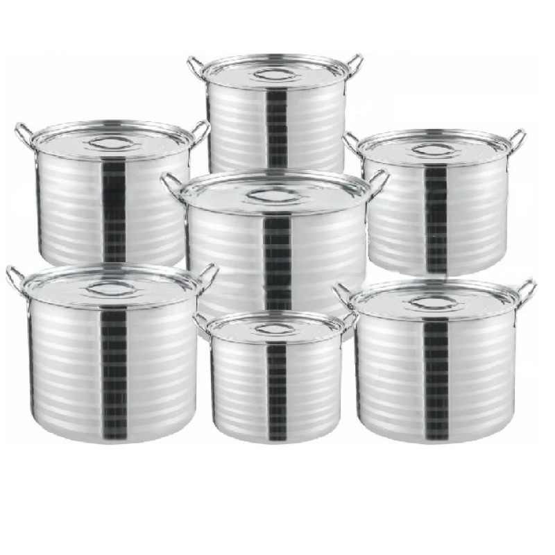 Набор кастрюль из нержавеющей стали с крышками. Размеры кастрюль : Кастрюля С Крышкой 4,0 Лтр. (22x15 см.). Кастрюля С Крышкой 5,55 Лтр. (24x16 см.). Кастрюля С Крышкой 7,5 Лтр. (26x18 см.). Кастрюля С Крышкой 9,6 Лтр. (28x20.2 см.). Кастрюля С Крышкой 13,70 Лтр.. (30x22.9 см.). Кастрюля С Крышкой 16,15 Лтр. (32x23.1 см.). Кастрюля С Крышкой 18,25 Лтр. (34x23.1 см.)