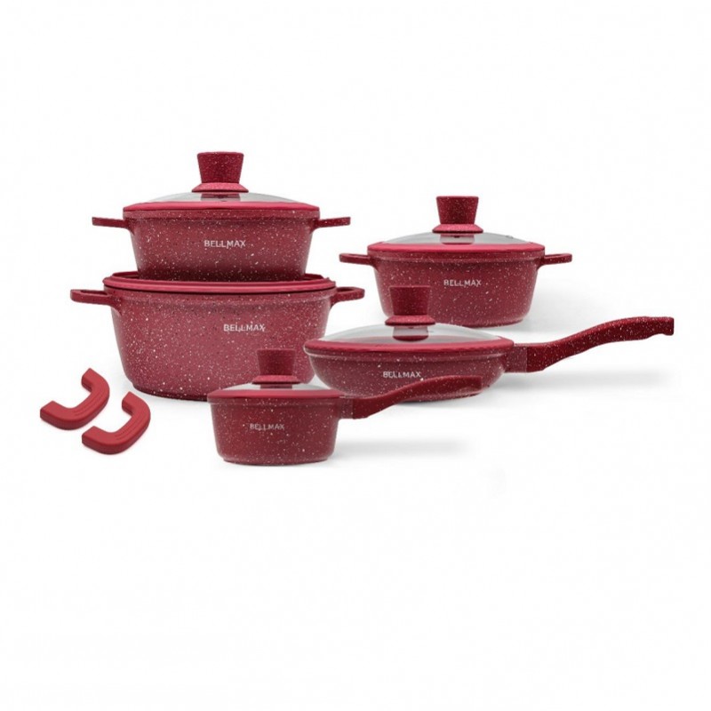 Набор Bellmax с внутренним антипригарным покрытием. Набор посуды имеет стеклянные жаропрочные крышки. Посуда имеет индукционное дно, что делает их современными. Многослойное антипригарное покрытие не влияет на вкус и запах пищи и предотвращает пригорание. Этот кухонный набор не содержит вредных веществ в своём составе и позволяет готовить пищу с минимальным количеством масла. Идеально для приготовления низкокалорийной, диетической еды. Набор посуды подходит для всех видов плит: газовых, электрических, индукционных, галогенных и стекло керамических. Можно мыть в посудомоечной машине. В набор входит : Казан с крышкой - 2,5л 20см. Казан с крышкой - 4,5л 24см. Казан с крышкой - 6,7л 28см. Сковорода с крышкой - 24см . Силиконовые прихватки - 2шт . Ковшик . Цвет набора - Чёрный , Красный .