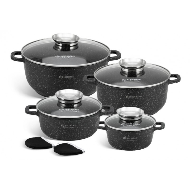 Данная модель посуды – высококачественный вариант от фирмы Edenberg. Набор выполнен из прочного и экологически чистого алюминия – безопасного для здоровья материала, который не вызывает аллергию и не выделяет вредных веществ в пищу даже при высокой температуре. Несъёмные литые ручки удобные, приятные на ощупь – когда пища приготовится, Вы сможете быстро снять посуду с огня благодаря ним. Кастрюля имеет внутреннее и внешнее мраморное покрытие. Антипригарное покрытие не позволит пище пригореть или прилипнуть к стенкам и дну. После готовки Вы легко сможете очистить казан самостоятельно, по желанию можно отправить в посудомоечную машину. Кастрюли подходят для использования на всех типах плит : газовых, электрических, галогенных, керамических и индукционных
