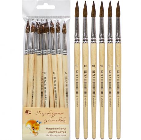 Пензлик художній кругла з волоса білки. Використовується при малюванні. Підходить для малювання аквареллю, гуашшю, акрилом. Довжина: 17 см. В упаковці 10 штук. Ціна вказана за 1 штуку.