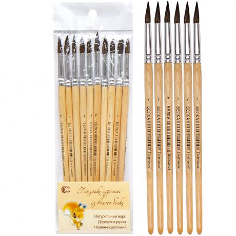 Пензлик художній кругла з волоса білки. Використовується при малюванні. Підходить для малювання аквареллю, гуашшю, акрилом. Довжина: 17 см. В упаковці 10 штук. Ціна вказана за 1 штуку.