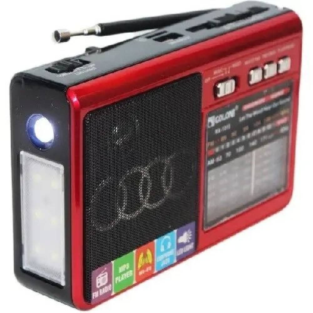 Радио GOLON RX-1313 может использоваться не только как радиоприемник, но и как проигрыватель mp3 и WAV файлов с USB носителей и SD карт. Длинная телескопическая антенна обеспечивает качественный прием радиостанций. Так же имеется удобный встроенный LED фонарик, а высокочувствительная колонка, отлично подходит для зон с неуверенным приемом.