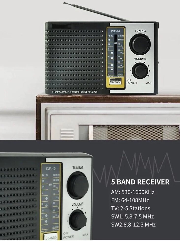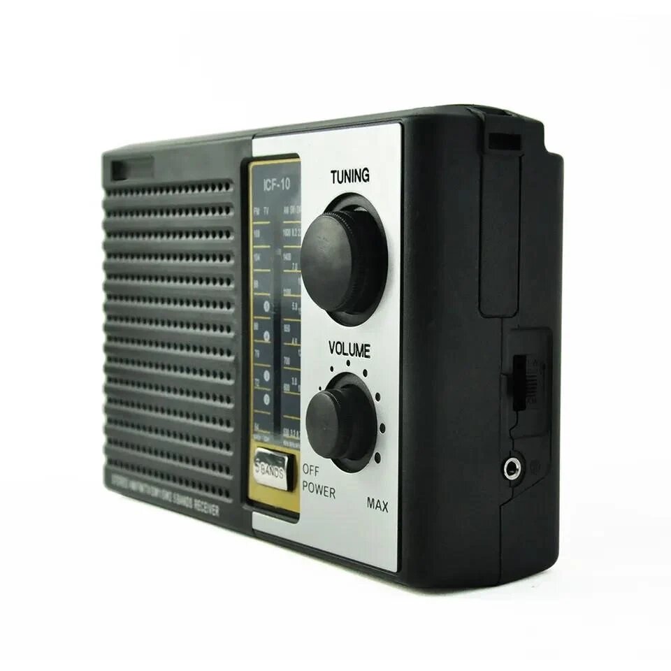 FM Радиоприемник радио Bodasan ICF-10. Радиоприемник всехволновой USB, SD. MP3, AUX. Через AUX также можно прослушивать аудио файлы. Длинная телескопическая антенна и плавная регулировка частоты обеспечивает качественный прием радиостанций. Характеристики: - Диапазон частот: FM 88 -108 MHz, AM 530 - 1710 кГц, SW 5.9 - 18 MHz, - МР3 плеер по AUX, с Flash накопителя и SD карты. . Выход для наушников. Радиоприемник Bodasan работает от сети 220В и от 18650 Li-ion батареи.В радио использованы современные динамики высокого качества.