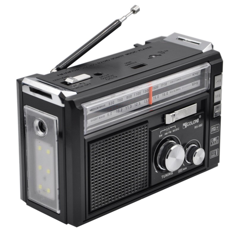 Радиоприемник Golon RX-382 будет отличным приобретением, ведь он имеет массу достоинств. Немного простой, советский дизайн радиоприемника компенсируется отличными техническими характеристиками. Радиоприемник автономный, может питаться от сети 220 или от аккумуляторов, что дает достаточно большую мобильность и различные варианты использования не только дома или на даче, но и в поездке или на природе. Для переноски радиоприемника можно использовать удобную ручку. Радиоприёмник c USB/SD функцией, съемным аккумулятором и фонариком. Принимает трансляции радиостанций в FM диапазоне, а также воспроизводит аудиофайлы в формате MP3/WMA (музыка и аудиокниги). Радиоприемник имеет встроенный фонарь, пригодится в темное время суток. Отличный выбор для дачи или дома! Данная модель радиоприемника всегда поможет вам насладиться любимой музыкой на природе или в дороге, а благодаря своему дизайну и функционалу вы сможете легко настроить вашу любимую волну. Характеристики: AM 530-1600 KHz;SW 3,4-23.0 MHz; FM 88-108 MHz; Частотный диапазон: заряд аккумулятора от сети: 220V/50Hz; работа от батареек (большая круглая - 2 шт.); аккумулятор; фонарик LED два режима. Функции: Воспроизведение аудио файлов в формате MP3 с карты памяти SD и флешки Режим переключения трэков с помощью кнопок на панели радио. Механический переключатель частот Механический поиск радиоволн Встроенный аккумулятор Механическая регулировка громкости Работа от встроенного аккумулятора или батареек (большая круглая) 2 шт, заряд аккумулятора от сети 220 в. Фонарь LED два режима Размер: длинна 16,5 см. ширина 7,5 см. высота 11 см.