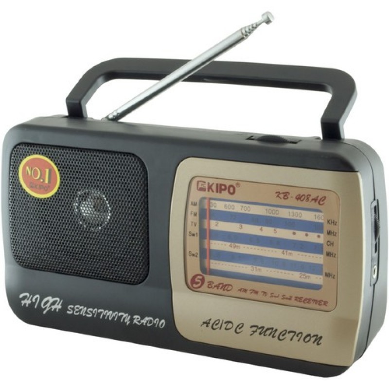 Радиоприёмник KIPO KB-408AC предназначен для прослушивания радиопередач на встроенный динамик или на головные телефоны. Питание осуществляется от сети 220 вольт или от двух батареек. Характеристики Страна-производитель товара Китай Питание от Сети, от Батареек Интерфейсы RCA-3.5 мм (Mini-Jack) Особенности со Встроенным FM-приемником Тип Портативные Выходная мощность 6 Вт