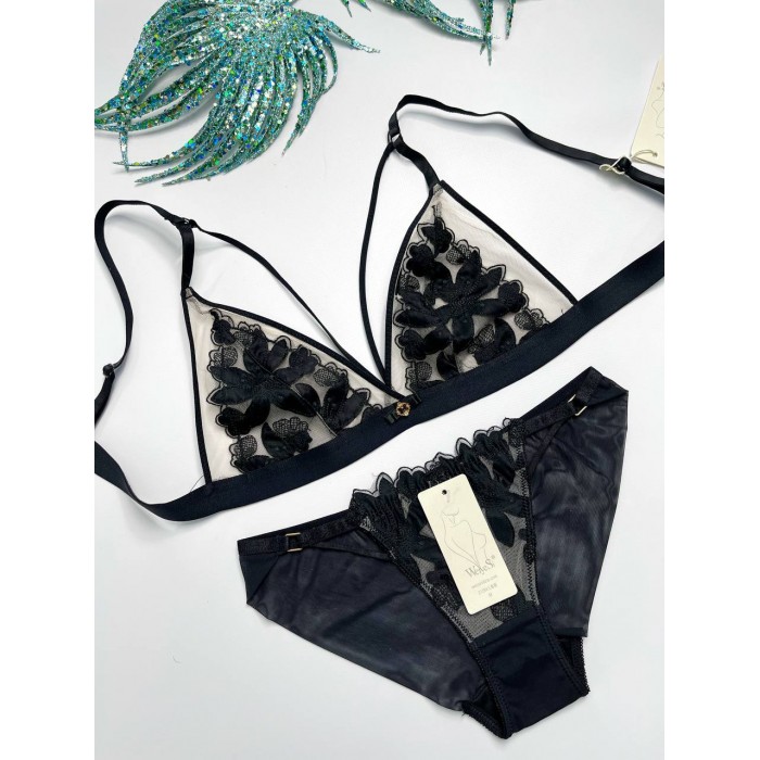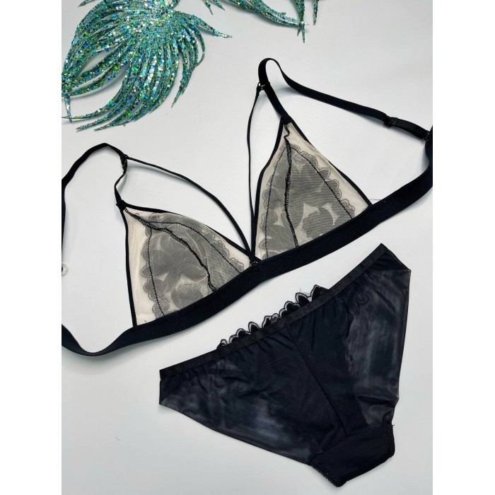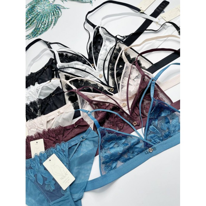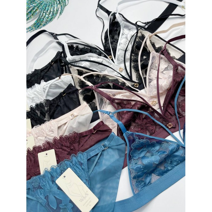 | ОПИСАНИЕ | Ажурный бюст без костей. Бретель - не съемная, спина - гладкая. Трусики на низкой посадке. |