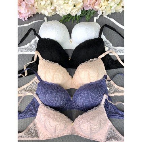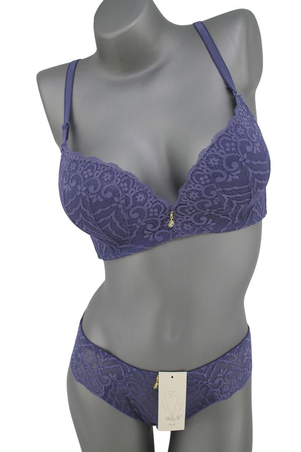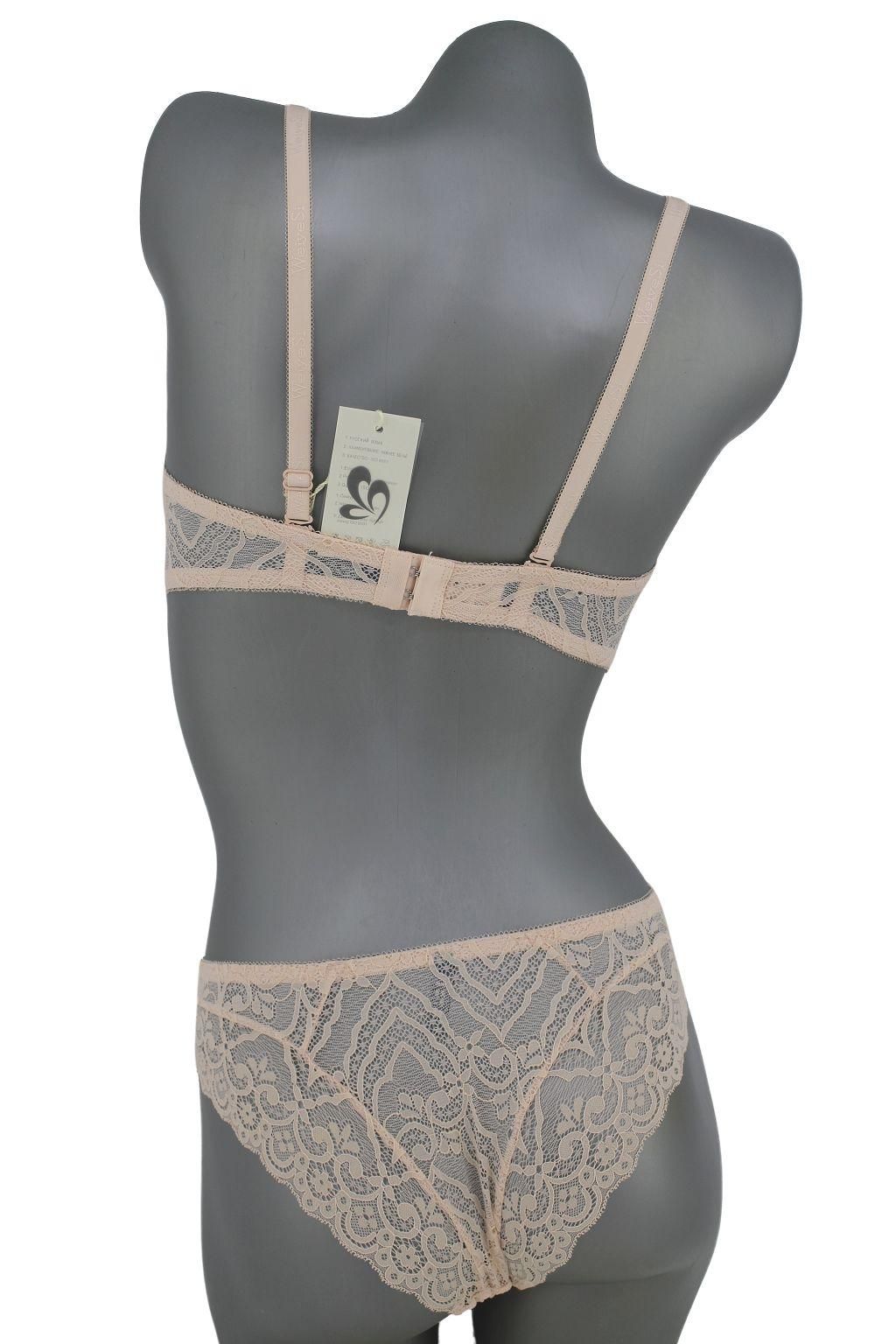 Описание: Ажурный бюст на тонком поролоне. Бретель – съемная, спина - ажурная. В комплекте трусики с низкой посадкой.