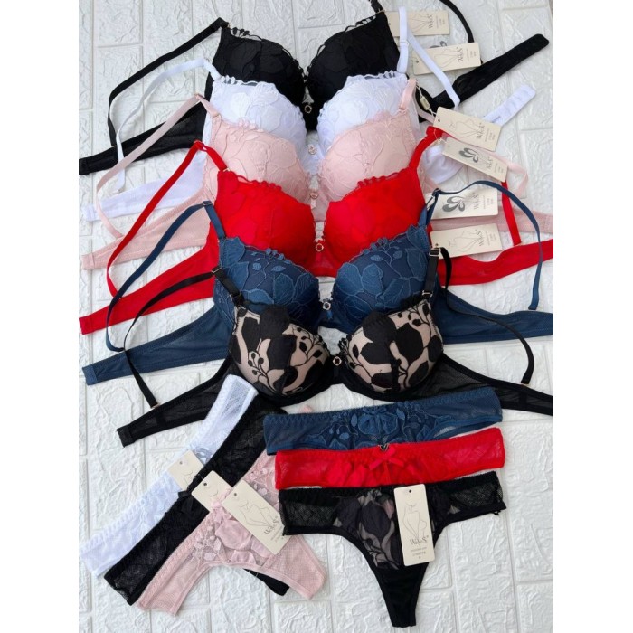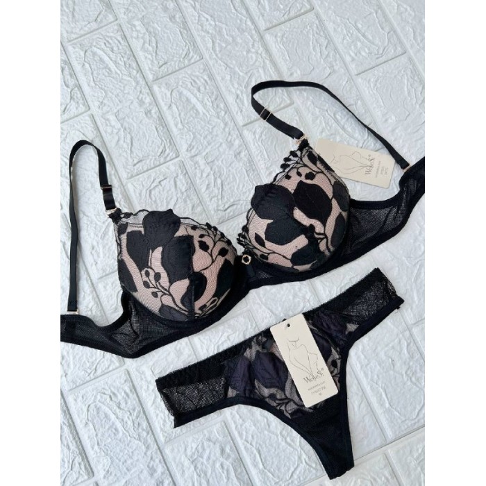 ОПИСАНИЕ Ажурный бюст на корректоре Рука Адама. Бретель - съемная, спина - сетка. Бикини на средней посадке.
