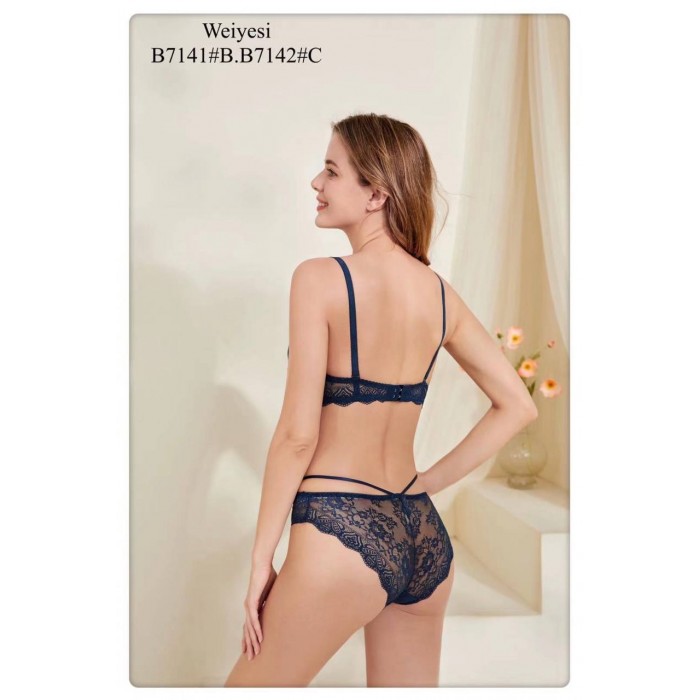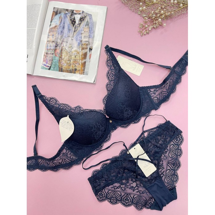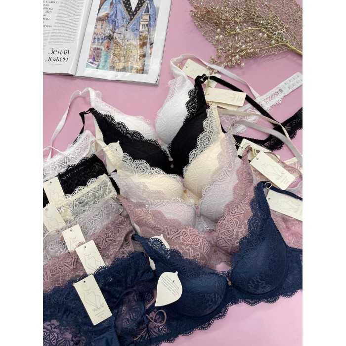 ОПИСАНИЕ Кружевной бюст на гелевом пуш-апе. Бретель - съемная, спина - ажурная. Трусики на средней посадке.