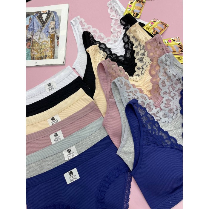 | ОПИСАНИЕ | Хлопковый топ со съемным поролоном с кружевными вставками. Трусики на средней посадке. |
