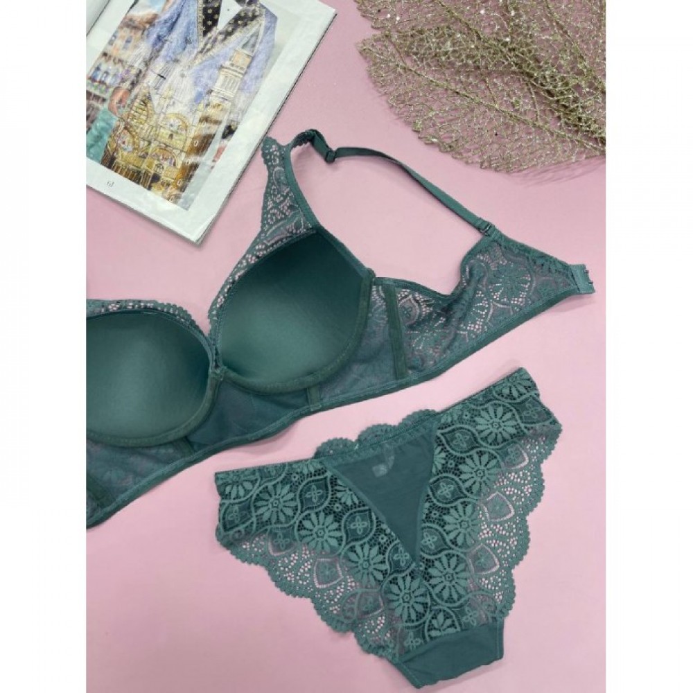 ОПИСАНИЕ | Ажурный бюст на поролоне. Бретель - съемная, спина - кружевная. Трусы на средней посадке. |
