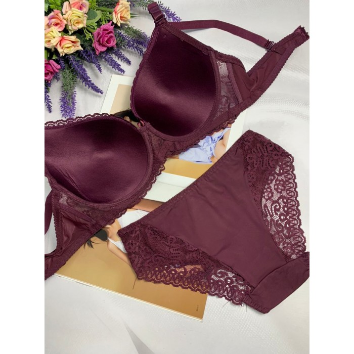 Описание: Гладкий бюст с ажурными вставками на поролоне. Бретель – съемная, спина - гладкая. В комплекте трусики на средней посадке.