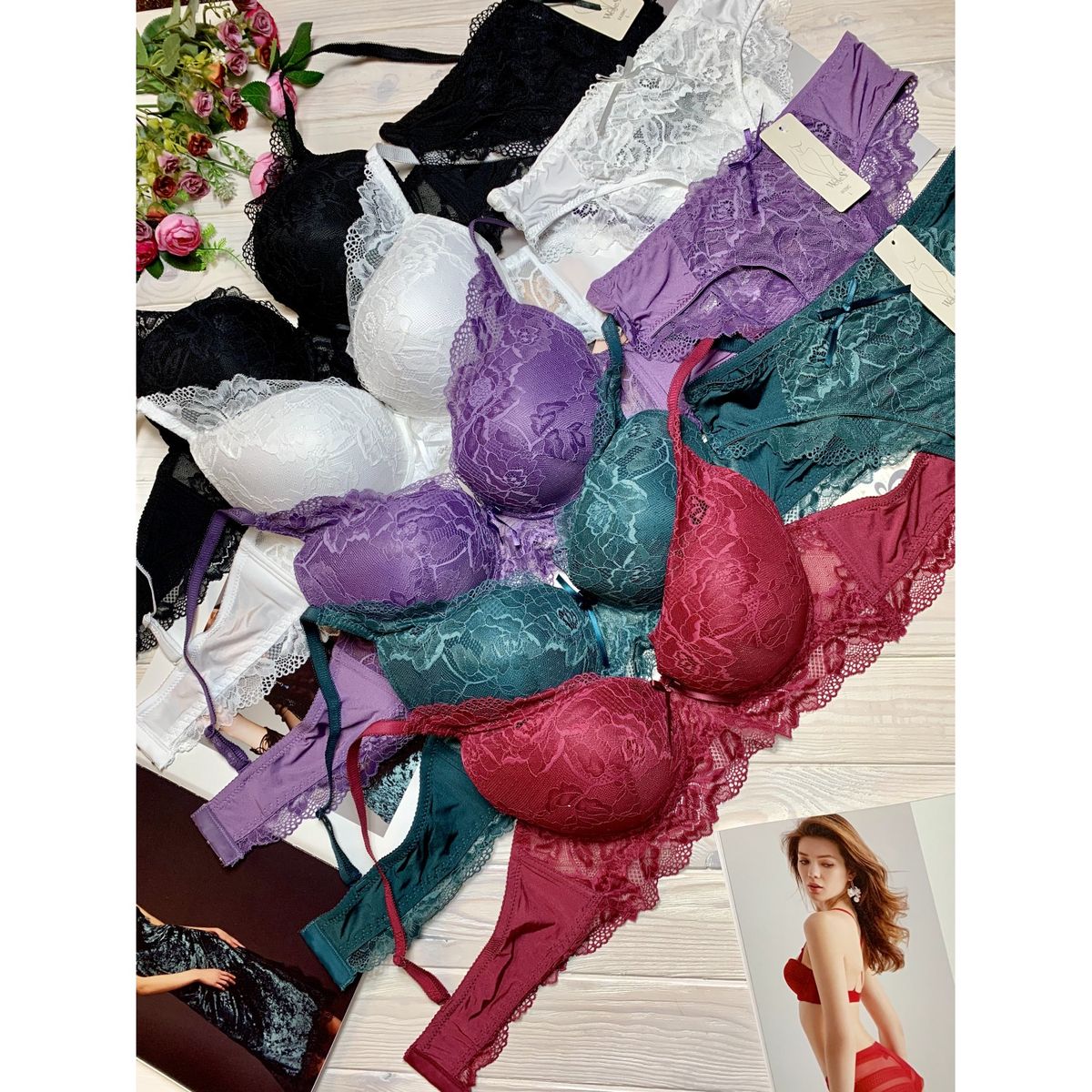 Описание: Ажурный бюст на тонком поролоне. Бретель – несъемная, спина - гипюровая. В комплекте ажурные трусы со средней посадкой.