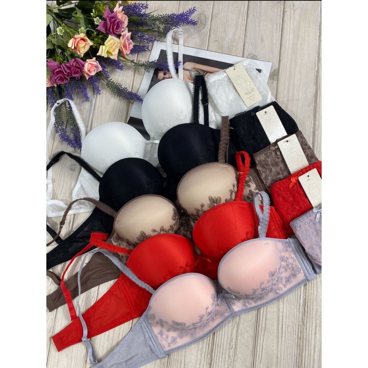 Описание: Ажурный бюст на корректоре,без костей. Бретель – съемная, спина - гипюровая. Трусики с низкой посадкой.