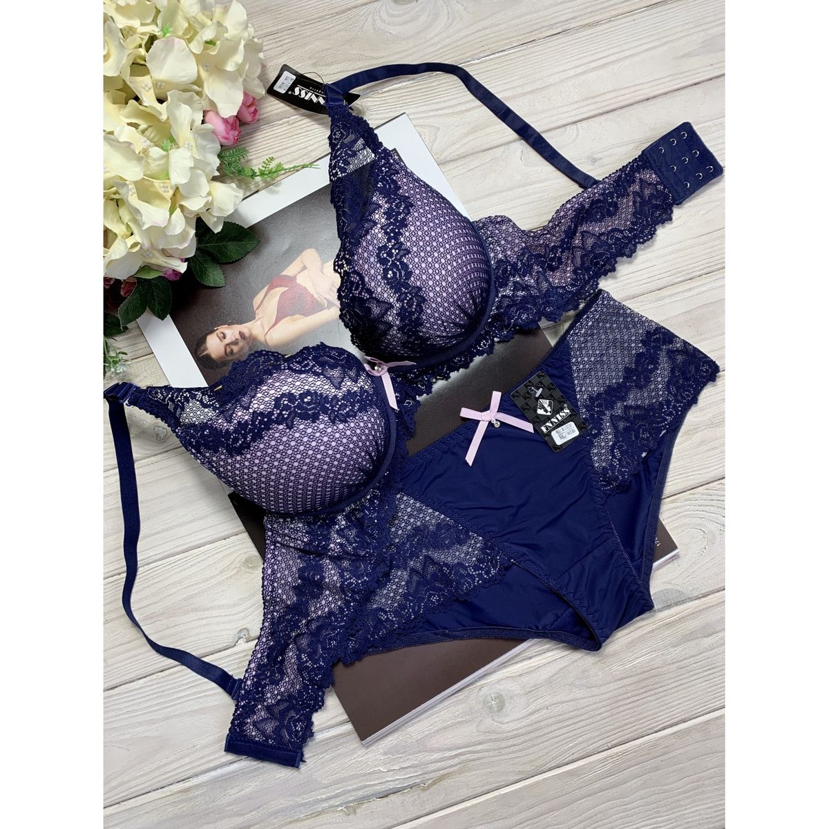 Описание: Ажурный бюст на паралоне. Бретель – съемная, спина - гипюровая. В комплекте трусики с низкой посадкой посадкой