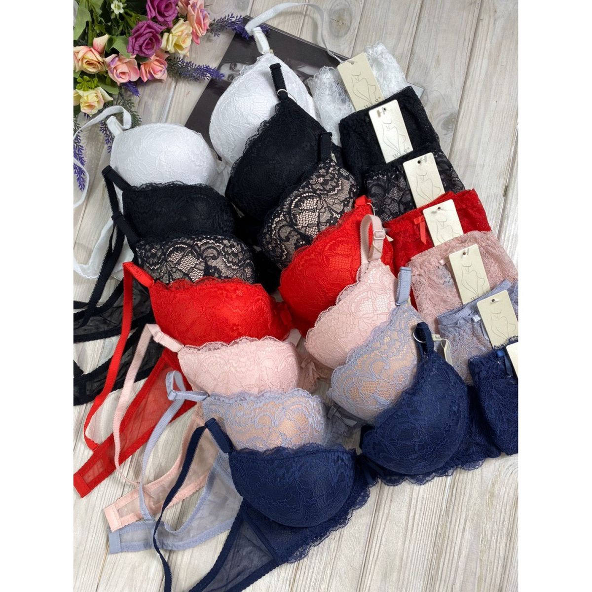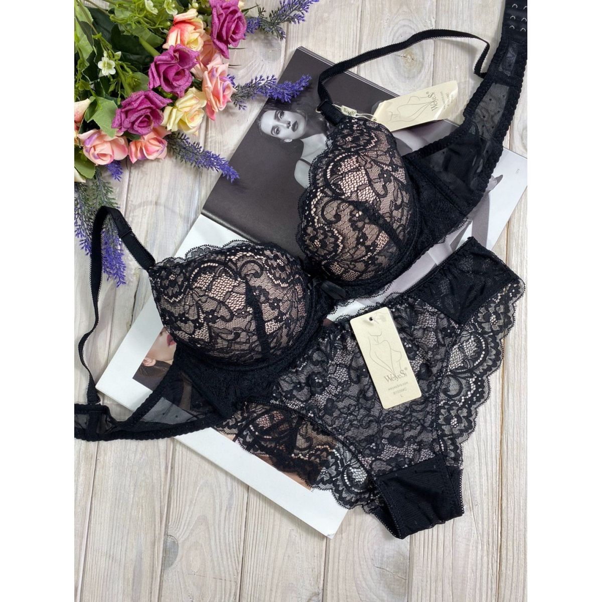 Описание: Ажурный бюст на поролоне. Бретель – съемная, спина - гипюровая. В комплекте трусики с низкой посадкой.