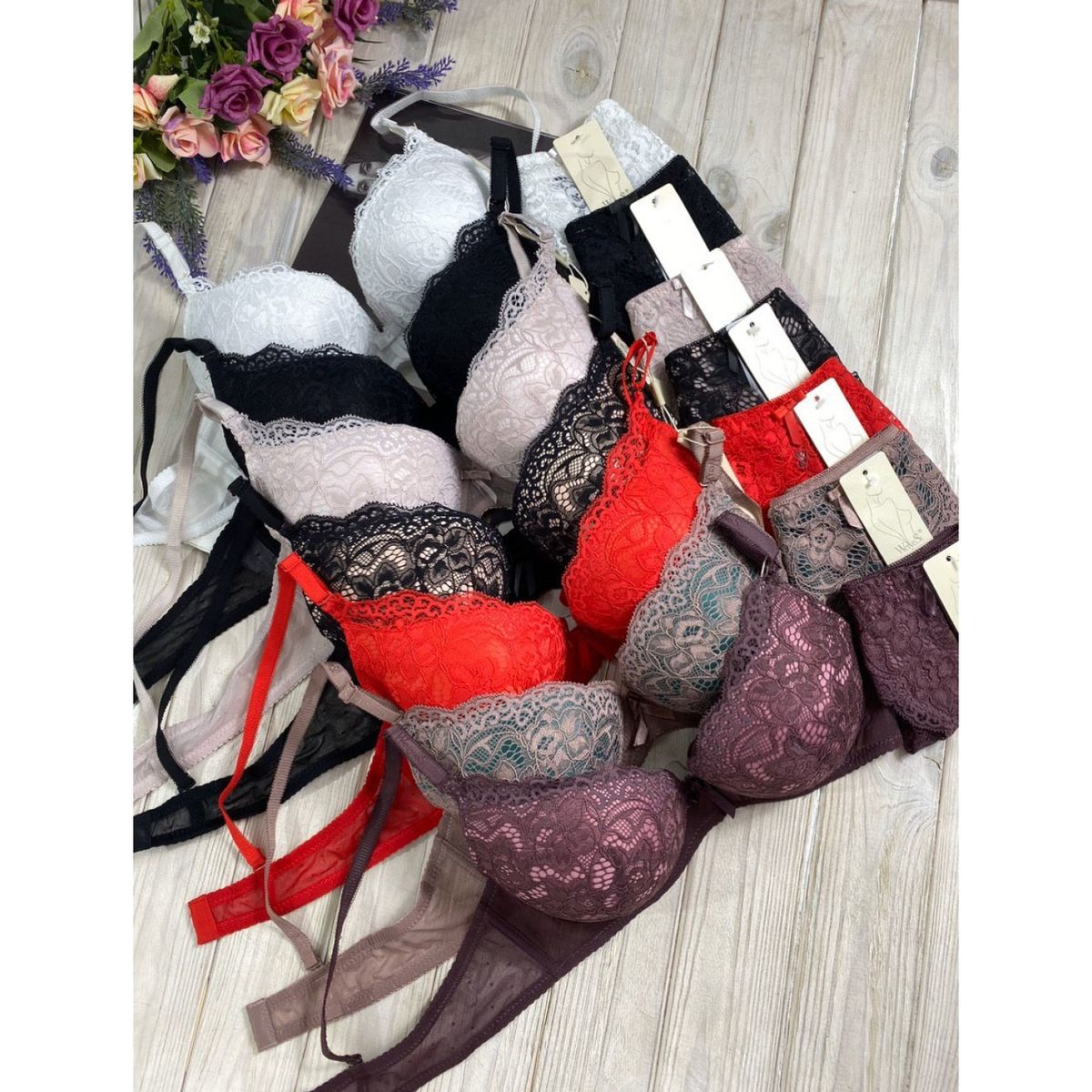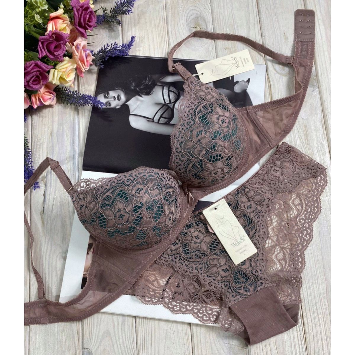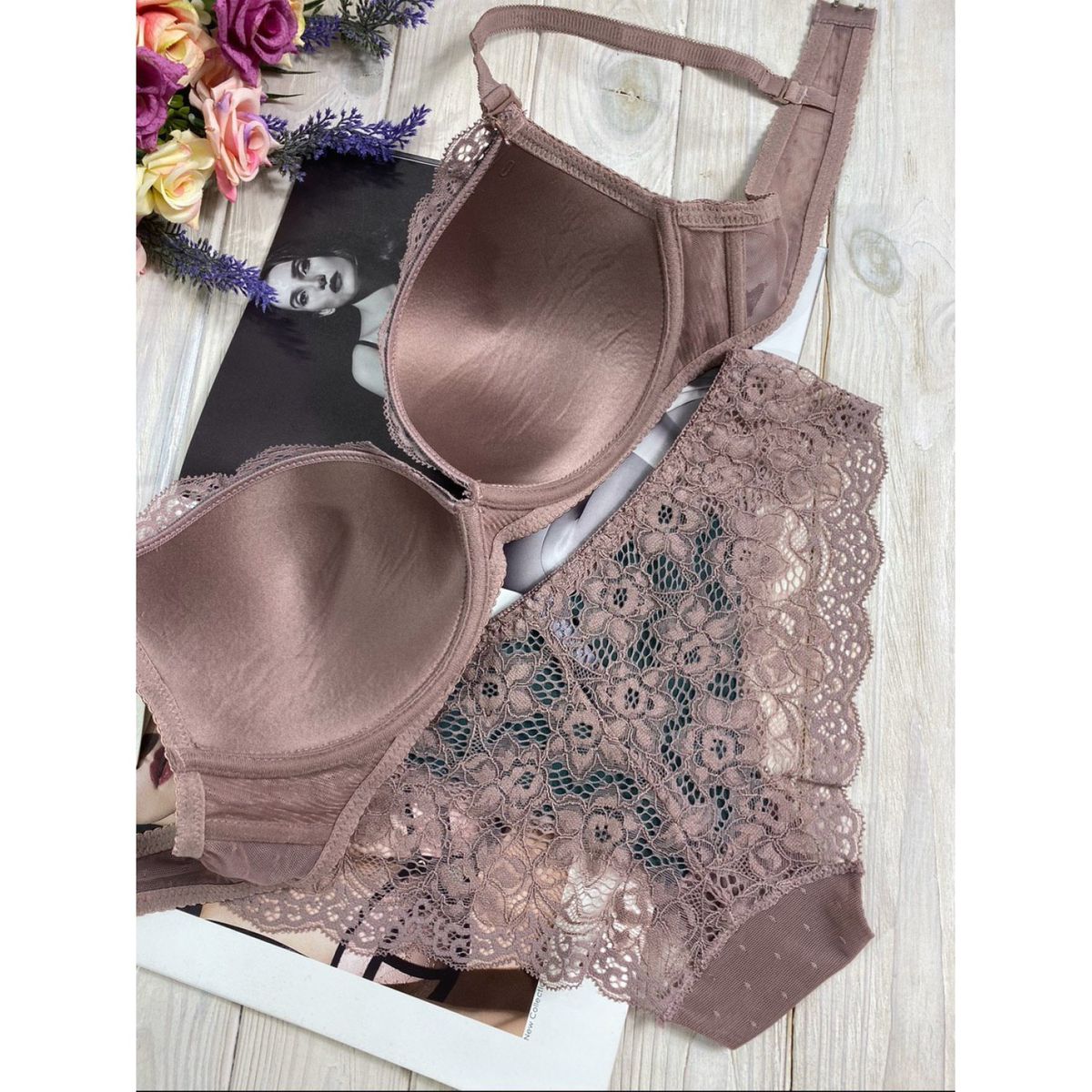 Описание: Ажурный бюст на поролоне. Бретель – съемная, спина - ажурная. Трусики с низкой посадкой.