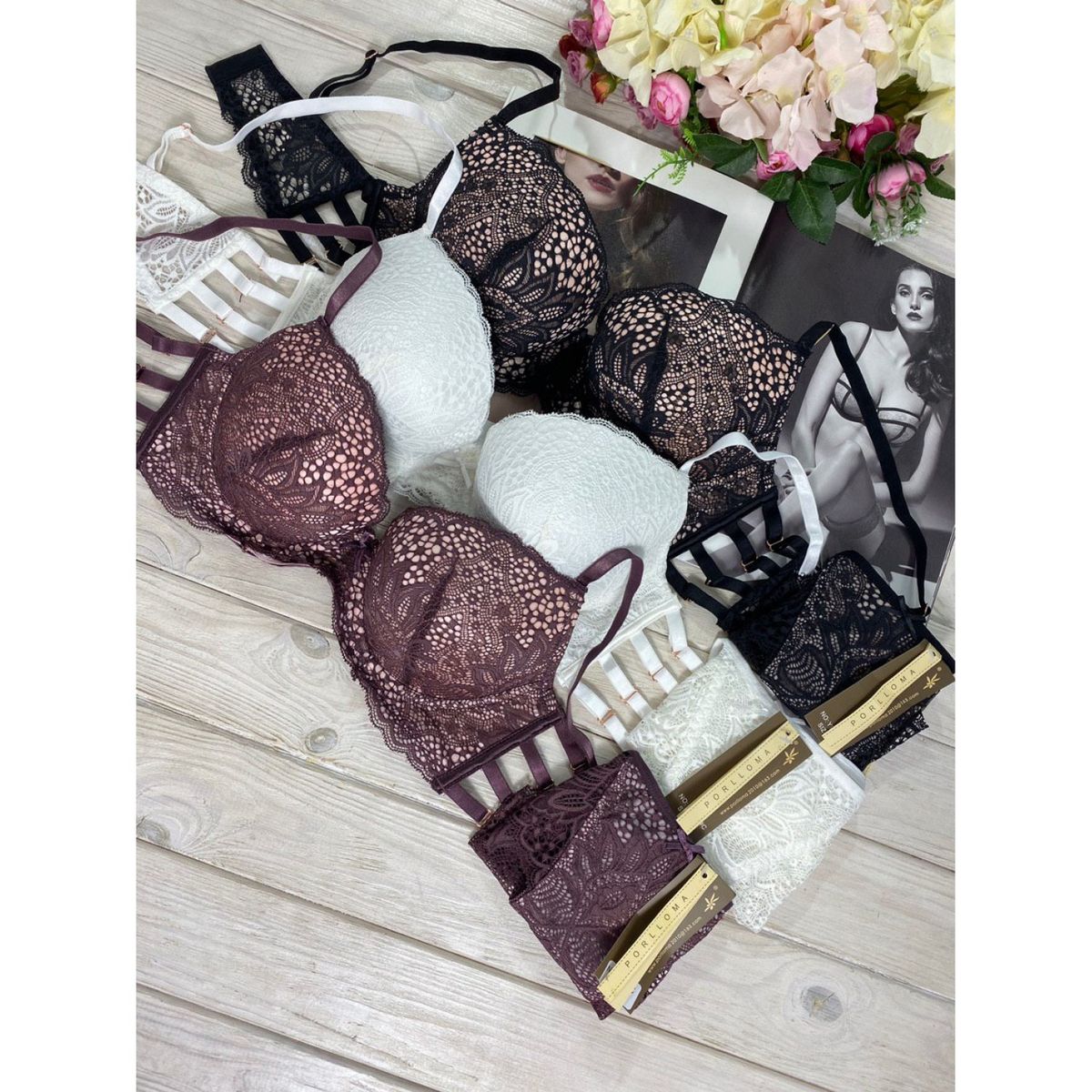 Описание: Ажурный бюст на толстом поролоне. Бретель – съемная, спина - ажурная. Ажурные трусики на низкой талии.
