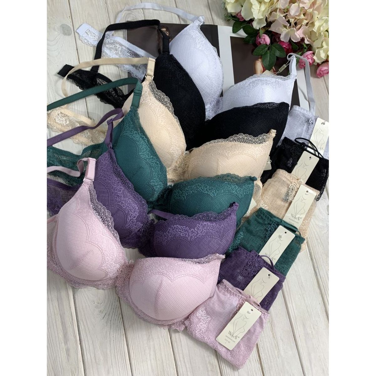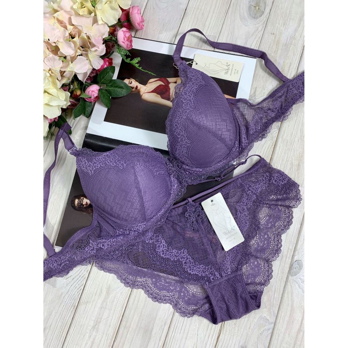 Описание: Ажурный бюст на тонком поролоне. Бретель – съемная, спина - гипюровая. В комплекте трусы с низкой посадкой