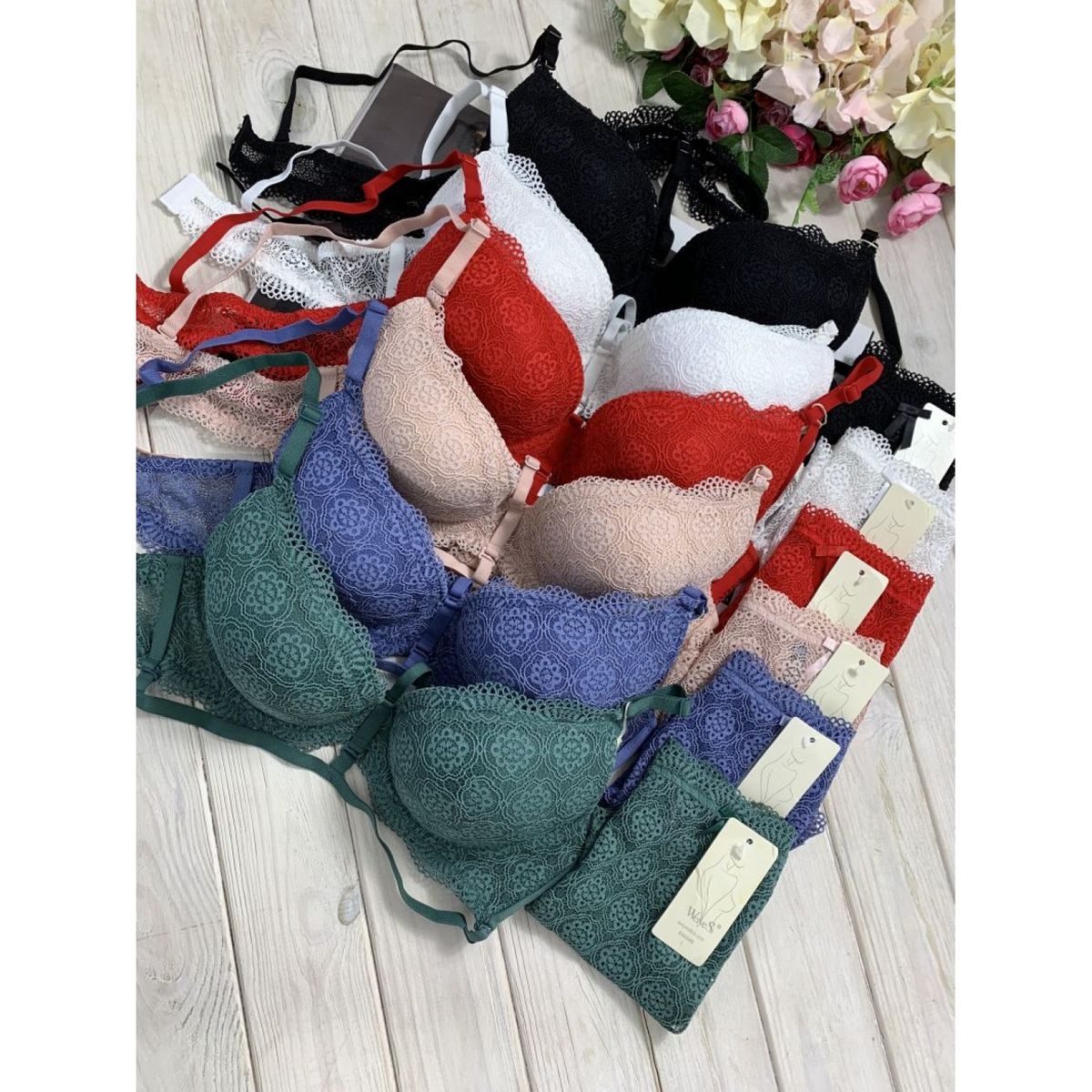 Описание: Ажурный бюст на тонком поролоне. Бретель – съемная, спина - гипюровая. В комплекте трусы с высокой посадкой