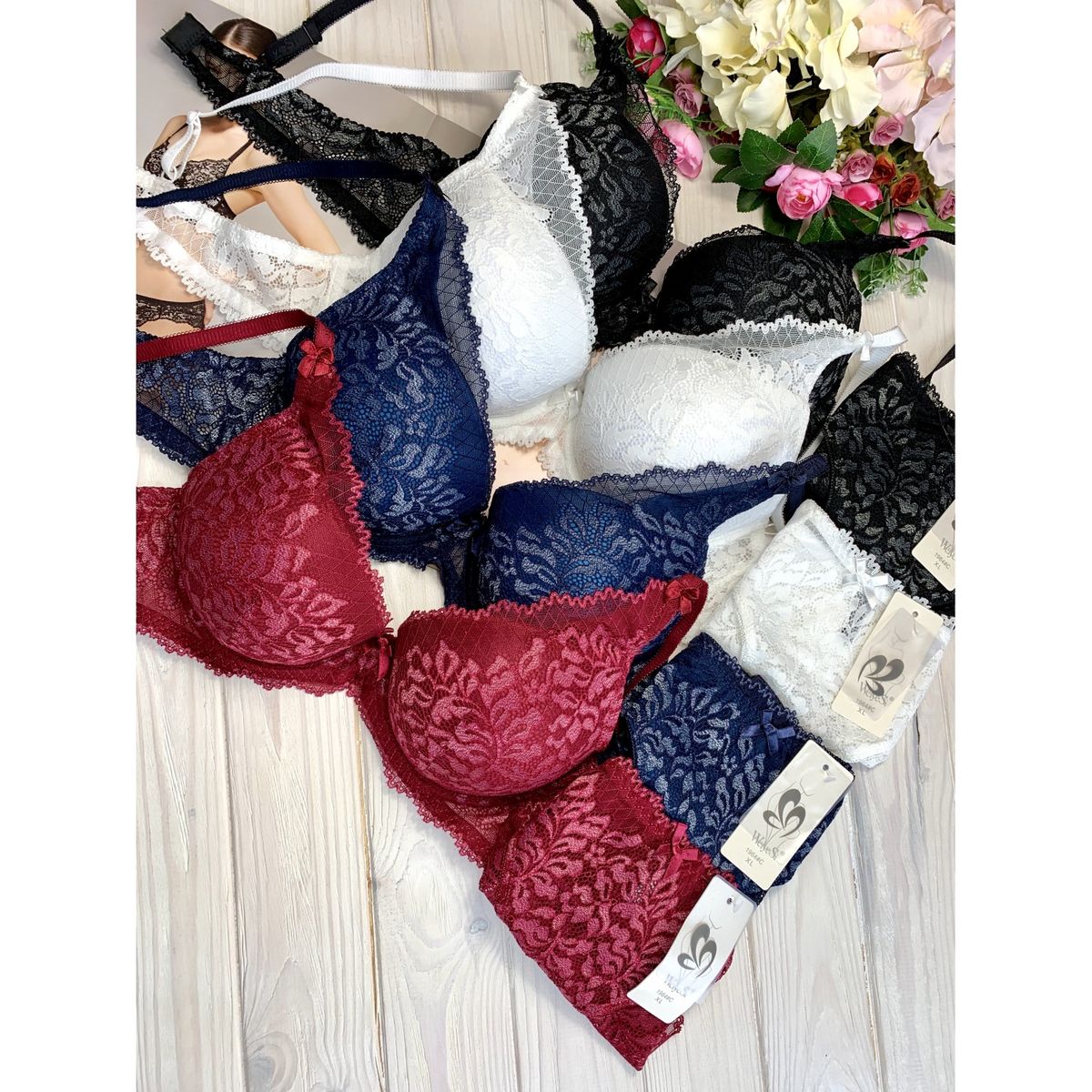 Описание: Ажурный бюст на пуш апе(рука Адама). Бретель – съемная, спина - гипюровая. В комплекте ажурные трусы с низкой посадкой