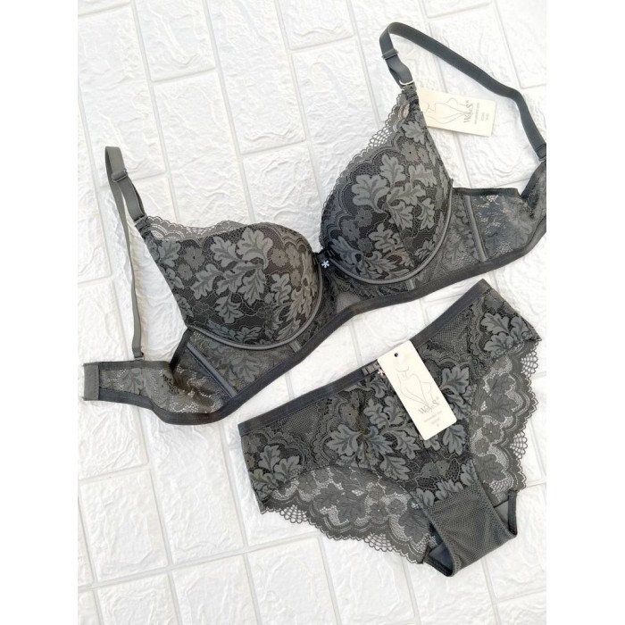 ОПИСАНИЕ Ажурный бюст на поролоне. Бретель - съемная, спина - кружевная. Трусы на средней посадке.