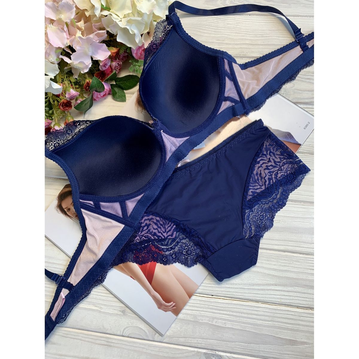 Описание: Ажурный бюст на тонком поролоне без костей. Бретель – съемная, спина - ажурная В комплекте трусики с низкой посадкой.