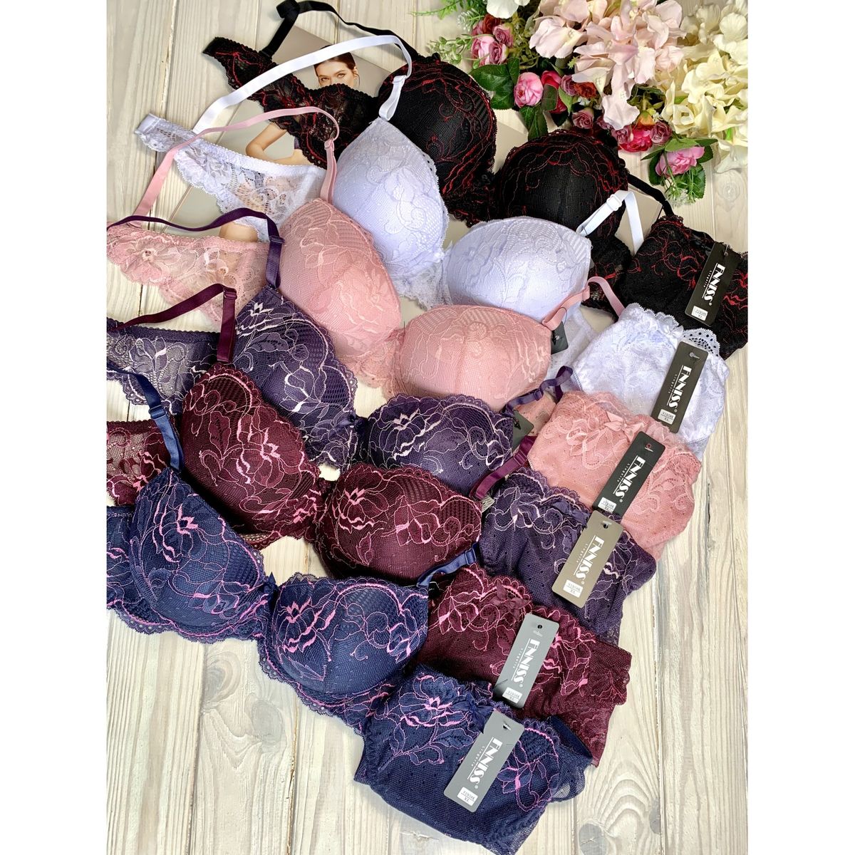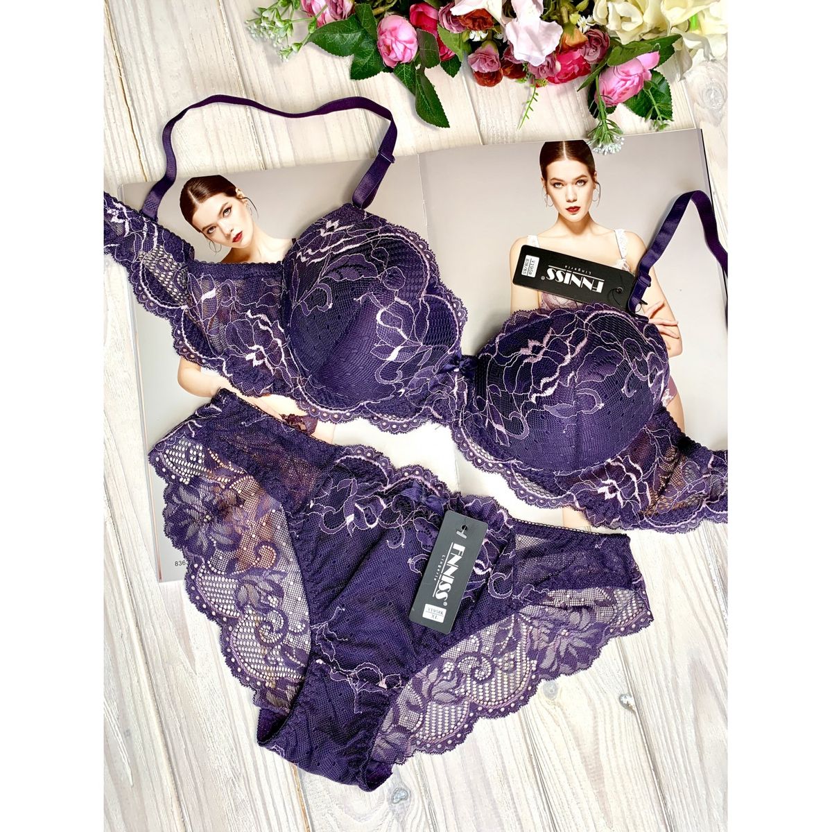 Описание: Ажурный бюст на пушапе. Бретель – съемная, спина - ажурная. В комплекте трусики с низкой посадкой.