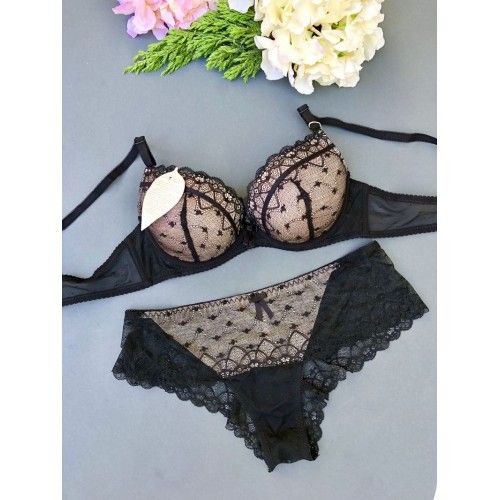 Описание: Ажурный бюст на гелевом пушапе(гелевые шарики) . Бретель – съемная, спина - гипюровая. В комплекте трусы с низкой посадкой.