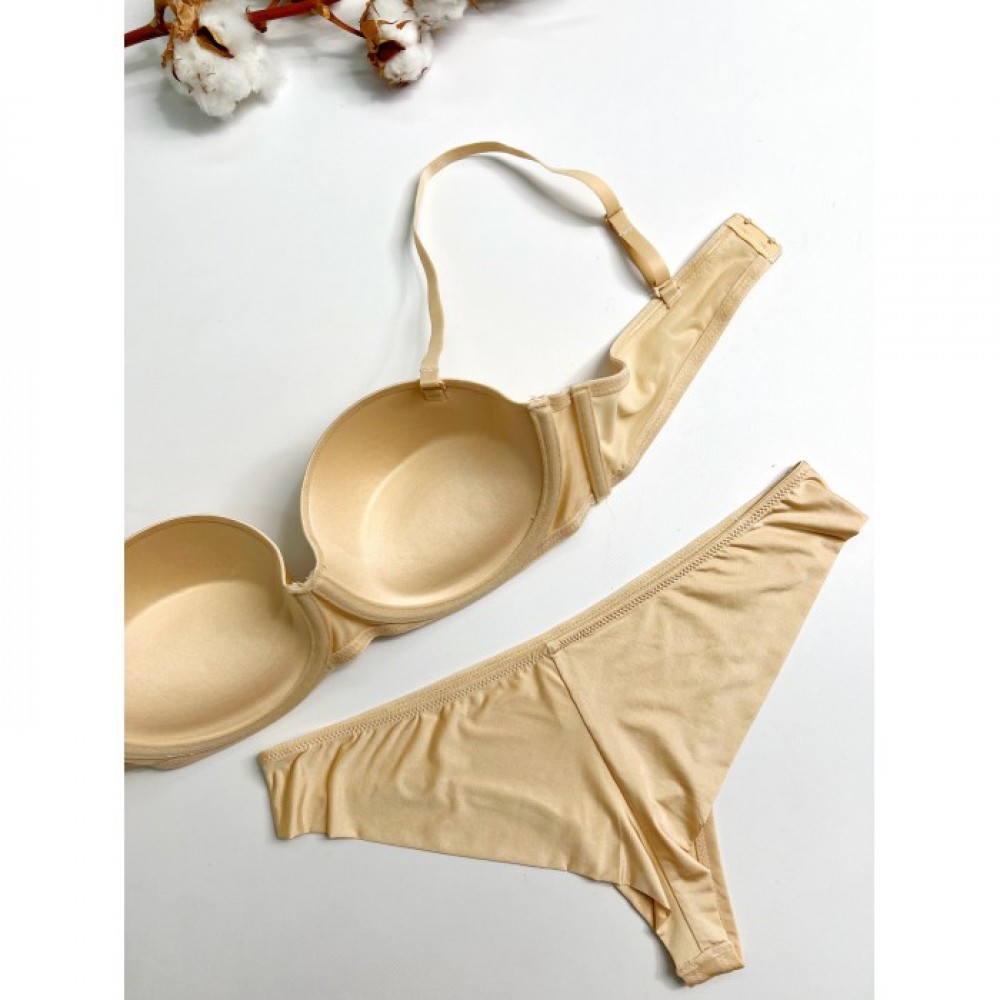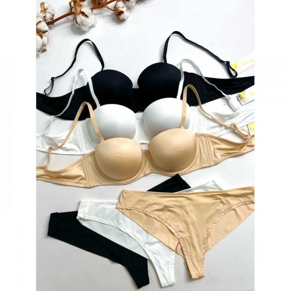 ОПИСАНИЕ Гладкий бюст анжелика на пуш-апе, бретель -съемная, спина - гладкая. Трусы на средней посадке.