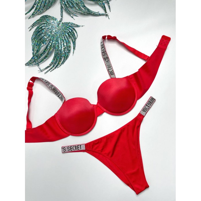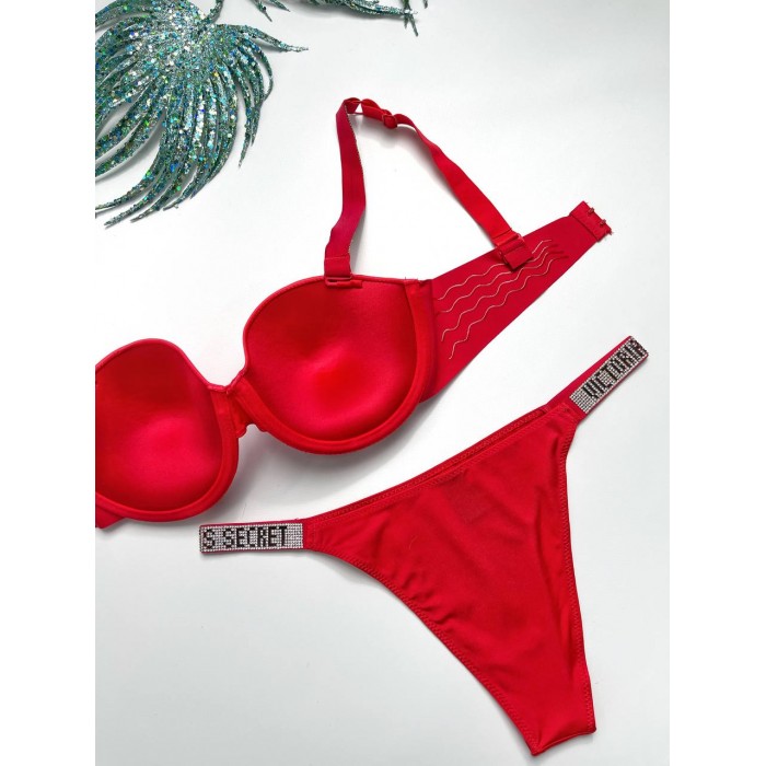 | ОПИСАНИЕ | Гладкий бюст на поролоне с силиконовой вставкой. Бретель - съемная со стразами, спина гладкая. Трусики на средней посадке. |