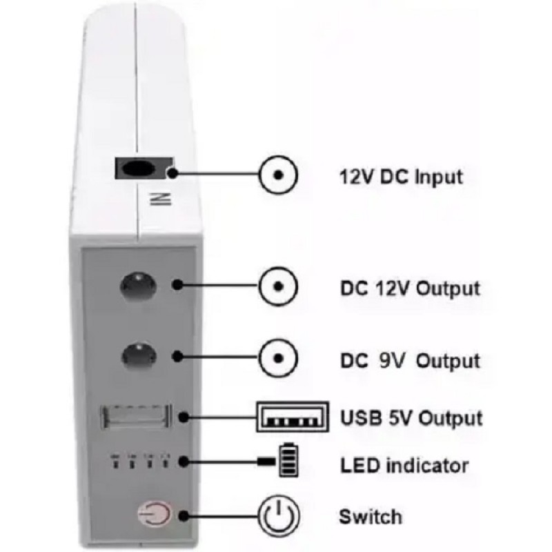 UPS WGP 103 – портативный, многофункциональный источник бесперебойного питания для обеспечения питания мелких электроприборов и аппаратуры, имеющих параметры питания: 5V, 9V или 12V (модемы, маршрутизаторы, оптические терминалы, аквариумное оборудование, камеры видеонаблюдения и т.п.) при экстренном отключении электропитания. Источник бесперебойного питания WGP103 имеет эргономичный дизайн, компактные габариты и вес, обеспечивающие удобство применения в бытовых условиях. WGP103 оснащен встроенным литиевым аккумулятором емкостью 10400mAh(4 элемента 18650 по 2600mAh), что позволяет на практике, например, работать роутеру до 10 часов без перерыва, зависит от тока потребления вашего устройства. С защитой от чрезмерной зарядки и разрядки, короткого замыкания и возможностью выбора выходного напряжения постоянного тока DC 9V, 12V, USB5V. Для питания, самого устройства, необходимо использовать блок питания, мощностью 24W(12V 2A). Основные характеристики: Емкость батареи - 10400mAh 3.7V 38.48Wh, Тип аккумуляторов - Li-ion. Вход - DC 5.5x2.1 12V 2A. Выходы - USB-A 5V 2A, DC 5.5x2.5 9V 1A, DC 5.5x2.5 12V 1A. Размеры - 116x73x24мм . Комплектация: DC UPS WGP-103. Переходники - DC 5.5x2.5 - DC 3.5x1.35. Кабель 2xDC 5.5x2.5 - DC 5.5x2.5. Кабель DC 5.5x2.5 - DC 5.5x2.5. Инструкция