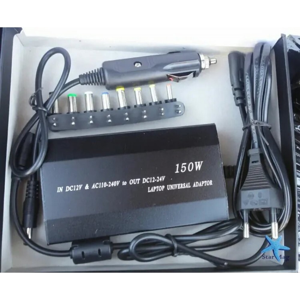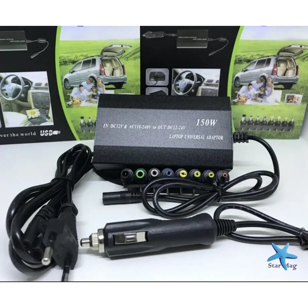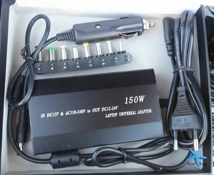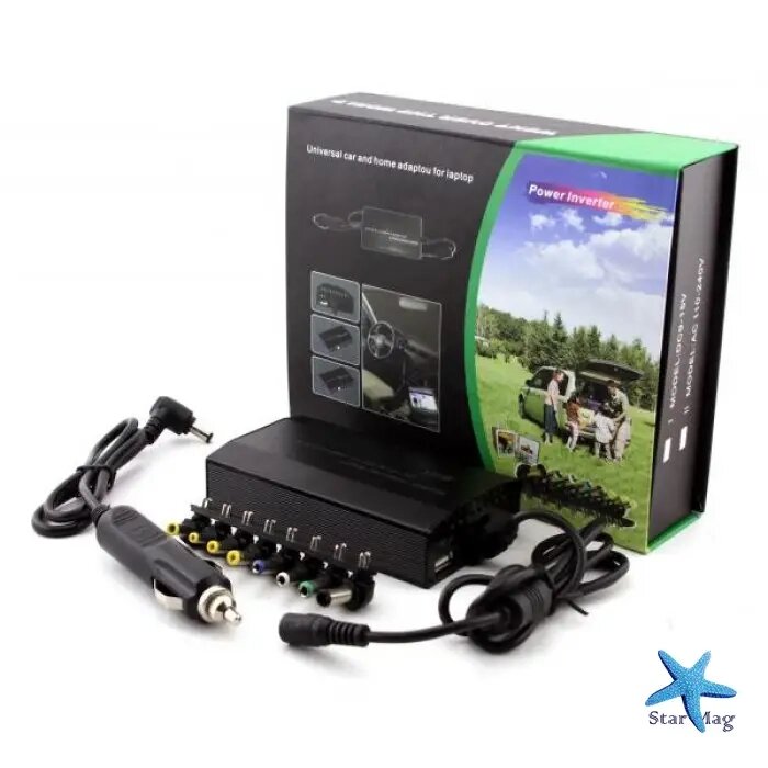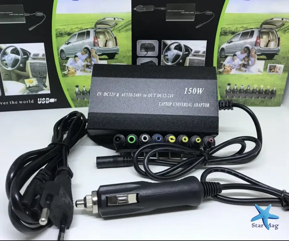 Универсальное автомобильное зарядное устройство для ноутбуков разных типов, заряжает батарею ноутбука от прикуривателя в автомобиле и от обычной розетки. В комплекте с универсальным блоком питания для ноутбука идет 8 сменных переходников, которые подходят не только для ноутбуков, телефонов,портативной цифровой техники: - HD плееры, фотоаппараты, видеокамеры, переносные телевизоры и DVD проигрыватели, игровые приставки, MP3 плееры, GPS навигаторы. Зарядное устройство имеет USB порт для питания и зарядки портативной цифровой техники, которую можно подключать одновременно с ноутбуком. Зарядное устройство имеет встроенную защиту от перепада напряжений, легко заменяемые разъемы, а также возможность выбора выходного напряжения. Максимальный выходной ток MY-150 составляет 5,5 А, что превосходит большинство стоковых зарядок. При такой мощности процесс подзарядки происходит максимально стабильно и быстро, даже при работающем ноутбуке .