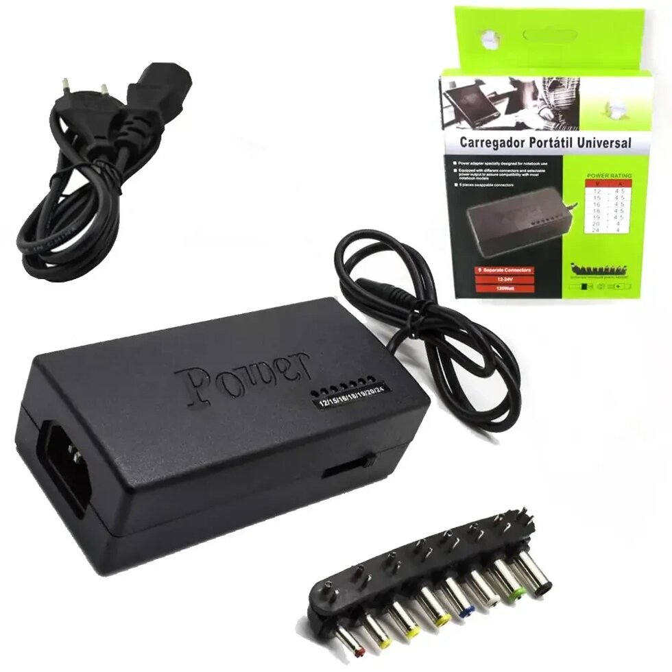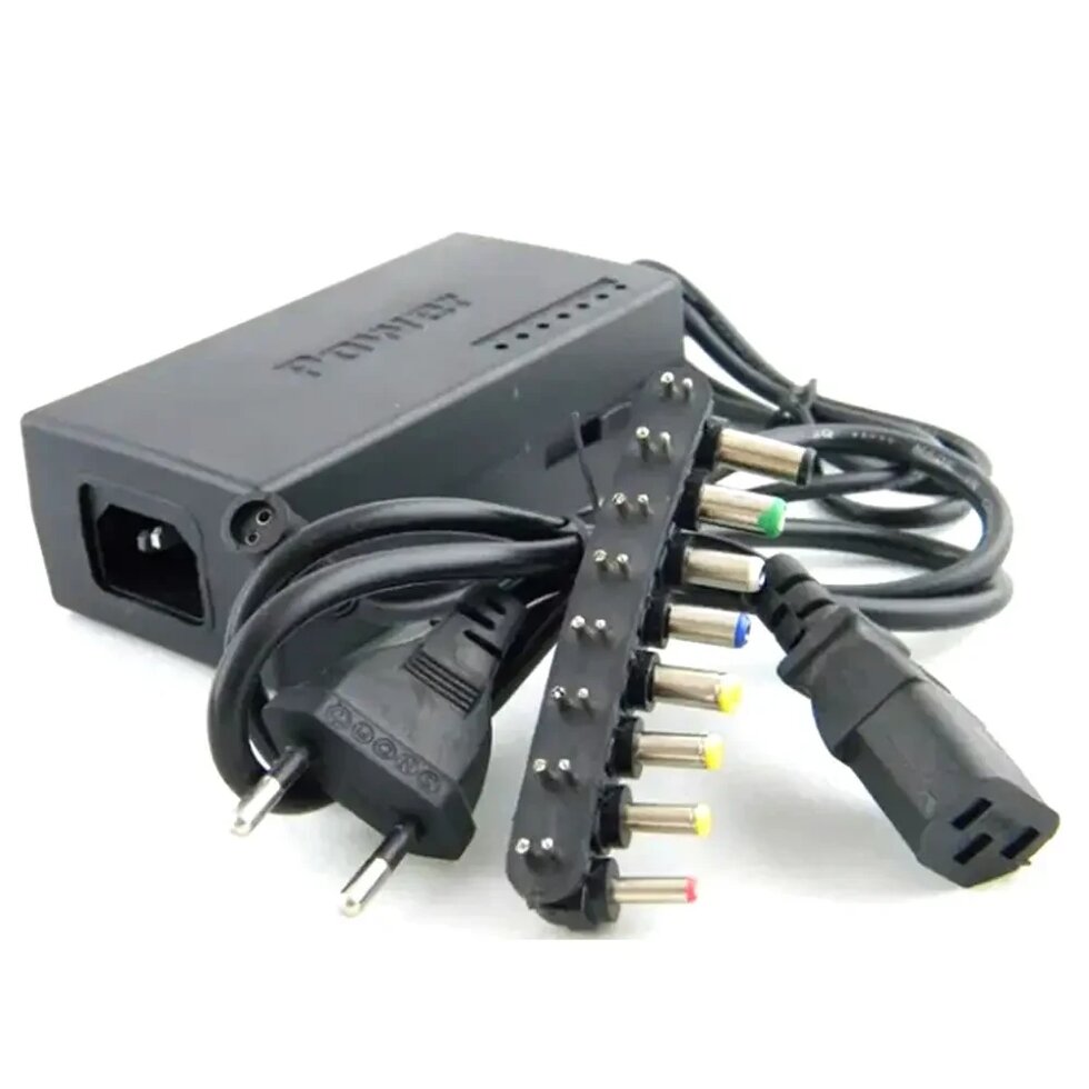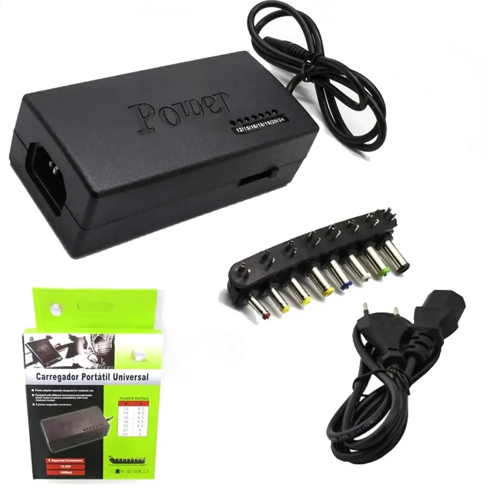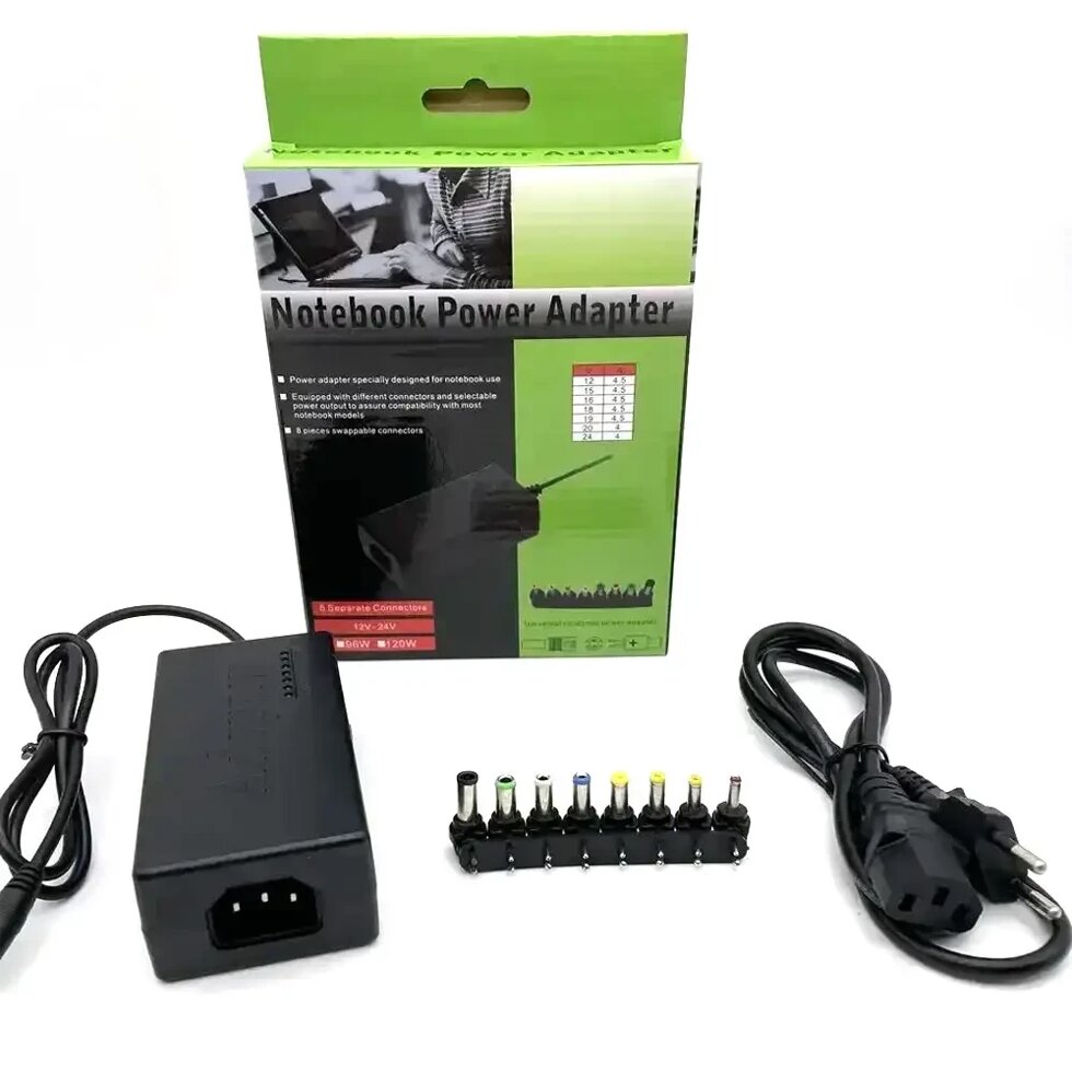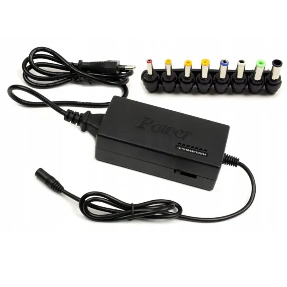 Адаптер для ноутбуков для ноутбуков MY - 100W поставляется вместе со специальным шнуром питания. Напряжение переключается при помощи бегунка, располагающегося на боковой части адаптера. Каждое последующее переключение будет отображаться на линейке зеленных светодиодов, напротив которых находится надпись с выходным напряжением. Вам всего-навсего потребуется подобрать нужную насадку, которая подойдёт под разъем имеющегося устройства.