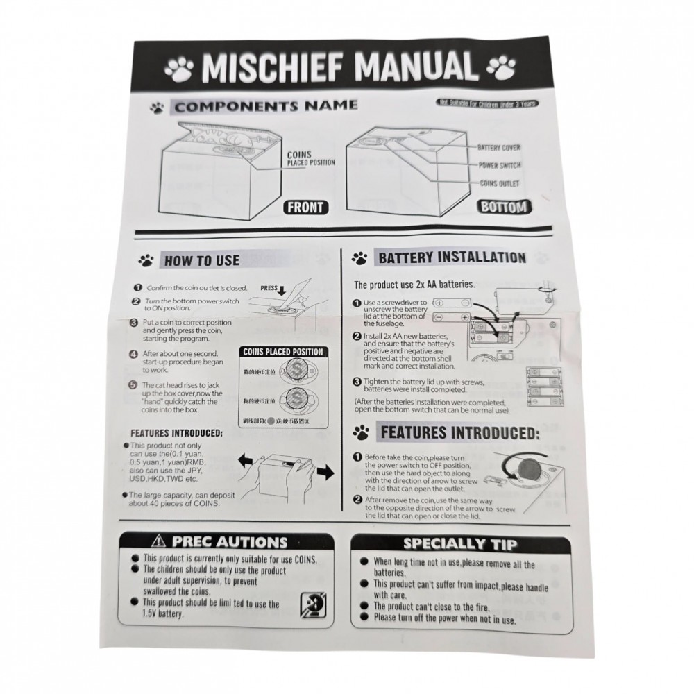 Интерактивная копилка в виде коробочки с котёнком. Положите монету на белую площадку - крышка приоткроется, кот выглянет и аккуратно утащит монету внутрь. Внутри есть переключатель питания, для извлечения накоплений откройте круглую крышку снизу. Забавный способ копить мелочь и удачный подарок детям и взрослым.