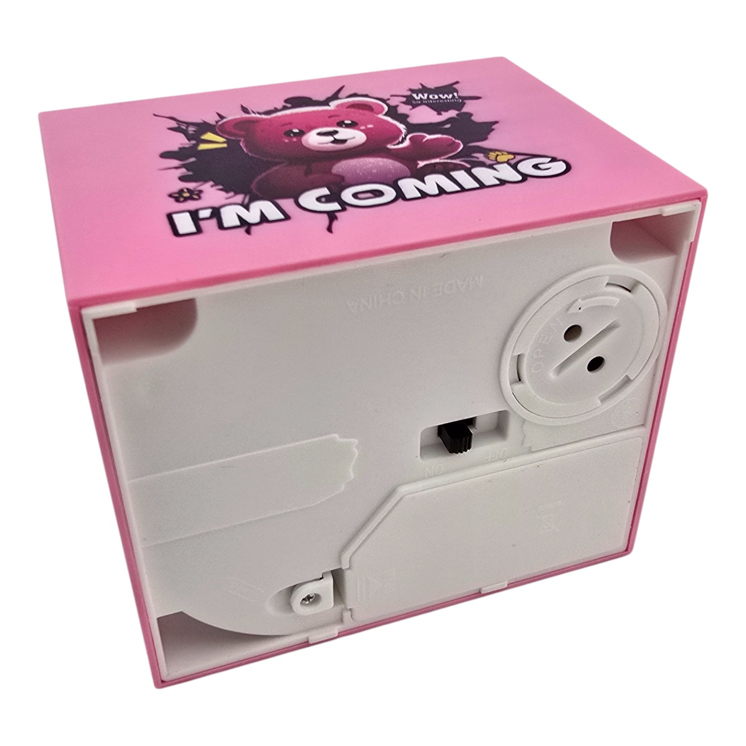 Забавная копилка в виде розовой коробки с медвежонком. Положите монету на круглую площадку, крышка откроется и лапка медвежонка аккуратно «утащит» монетку. Есть звуковые эффекты, копить деньги становится интереснее. Работает от двух батареек AA, монеты достаются через нижнюю крышку.