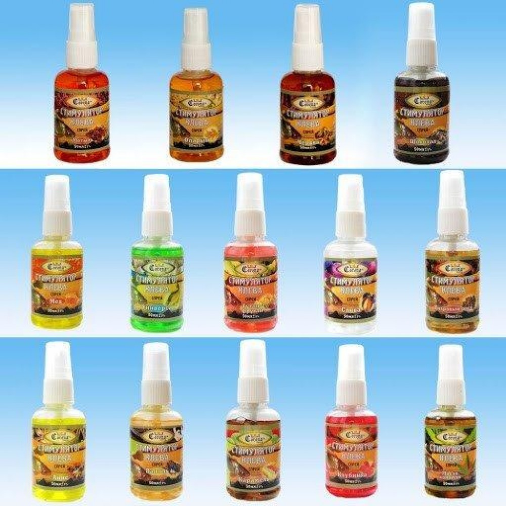 Ароматизатор для рыбалки выпускается в виде спрея. Большое количество вкусов можно использовать для того, чтобы составить свой аромат или воспользоваться готовым.