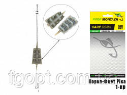 Оснастка Карп-Флет Река (1крючок) - создана для ловли на течении. Благодаря применению специальной кормушки с шипами-грунтозацепами такой монтаж стабильно держится в точки ловли на значительном течении. В условиях ловли крутых бровок и склонов на озерах и водохранилищах также оправдано применение монтажа карп-флет река. Не зависимо от веса, трапециевидная форма флет-кормушки позволила реализовать смещение центра тяжести к хвостовой части, что значительно улучшило дальность заброса. Кормушка Flat-Река универсальна в использования и подходит для всех видов методных прикормок и пеллетса. Для удобства использования и облегчения наполнения кормушки кормом, была разработана прес-форма на кнопке: "ПРЕСС-ФОРМА ДЛЯ КОРМУШЕК FLAT-РЕКА"