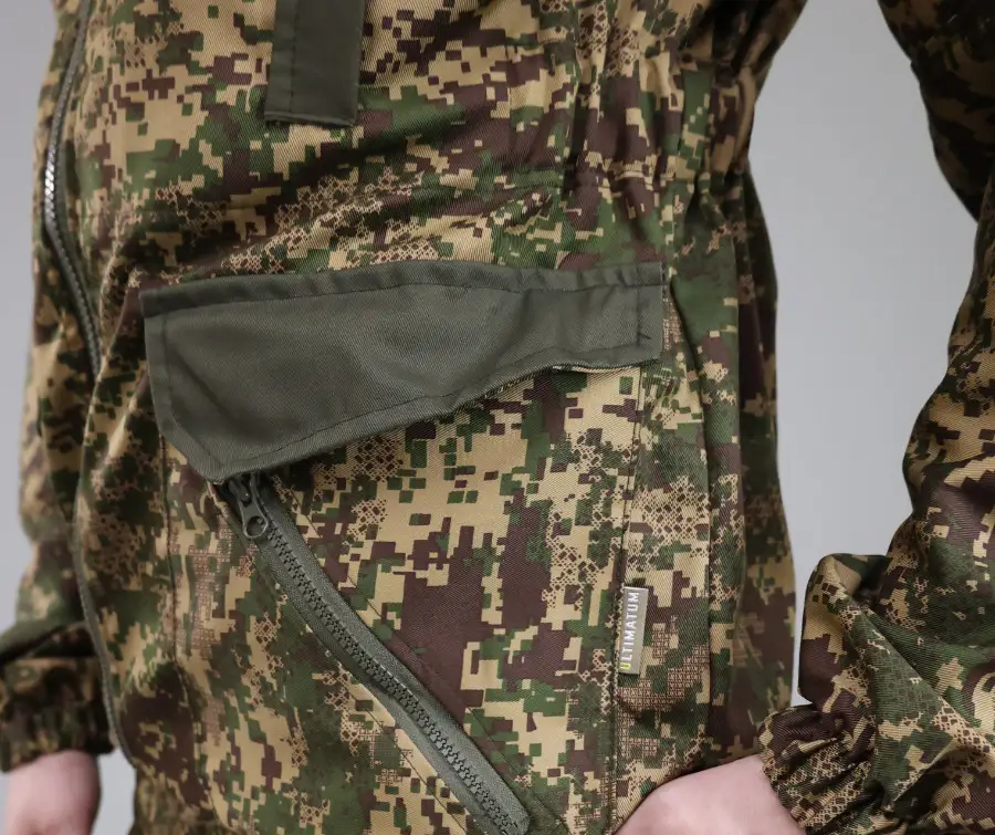 - Для отделки и усиления критических для износа и промокания зон (спина, грудь, плечи, локти, колени, ягодицы, бедра) используется дополнительный слой ткани – стрейч-коттон.