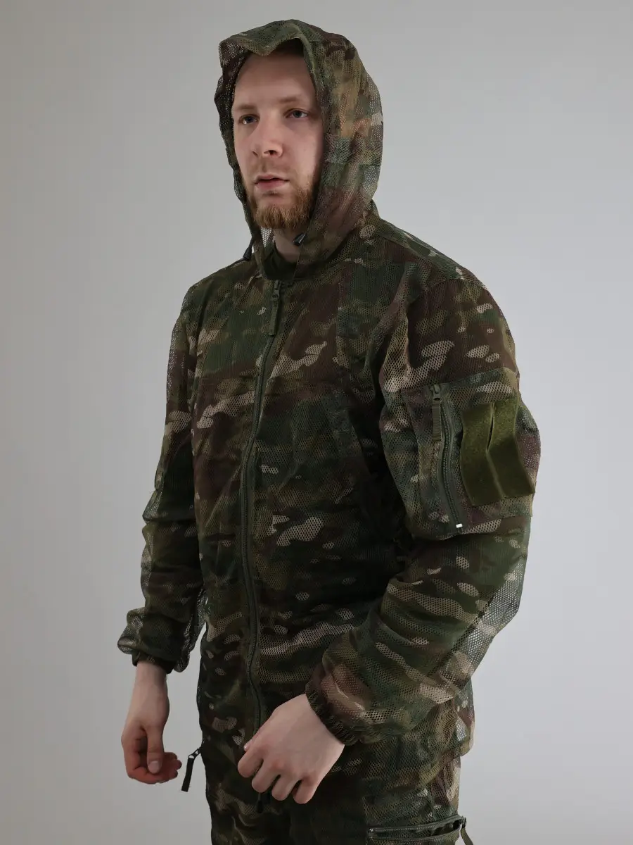 Костюм камуфлированный с капюшоном для рыбалки в жаркую погоду. Легкий летний костюм для жаркой погоды, который поможет уберечься от солнечных ожогов. Также может использоваться для маскировки на болотистой местности охотниками и военными.