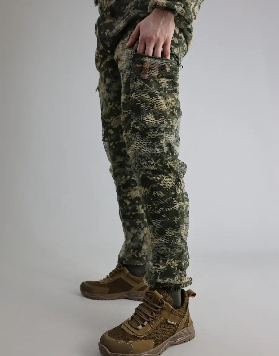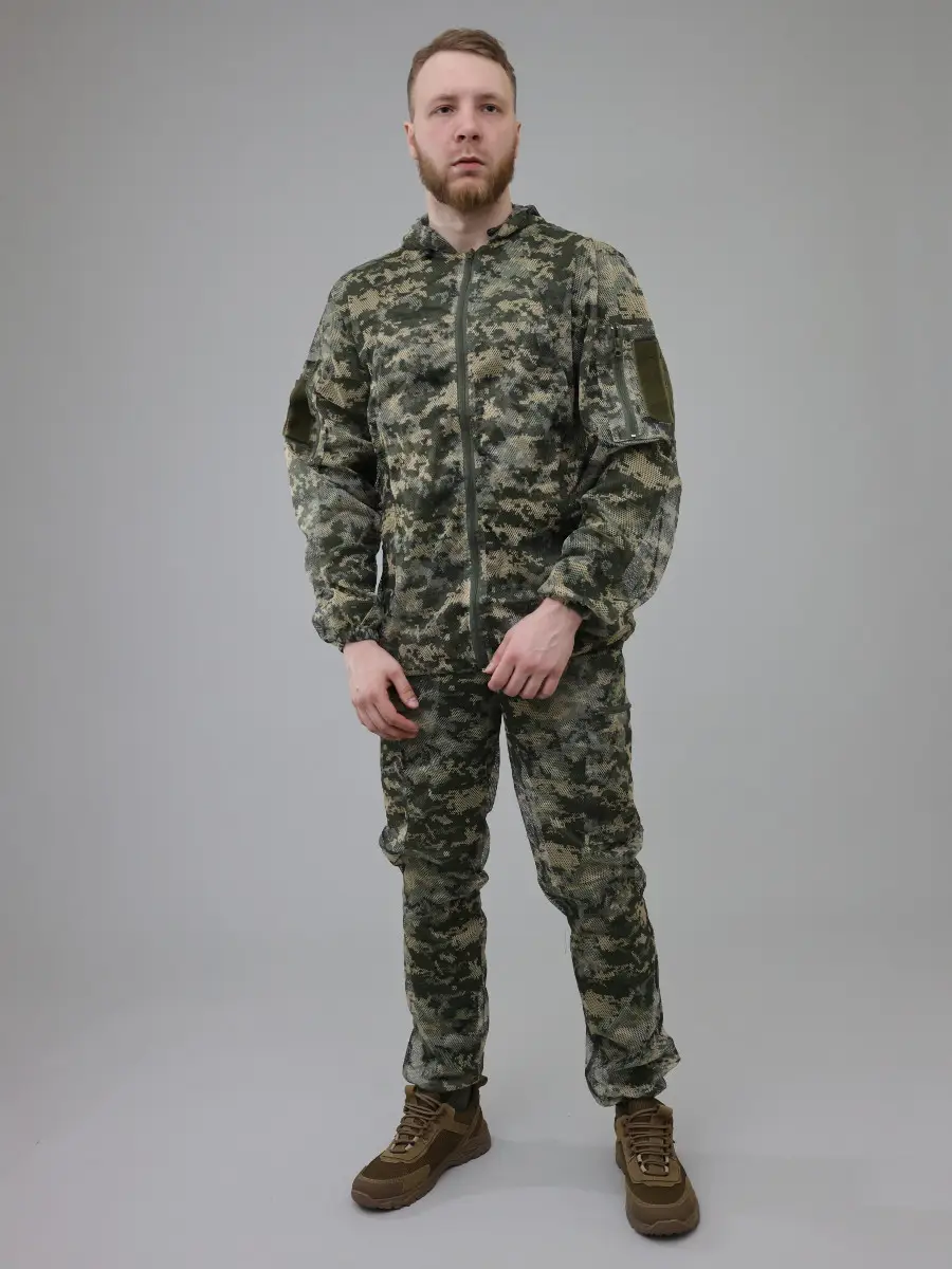 Особенностью данного костюма «Мультикам» является его материал производства, представляющий собой многослойную сетку. Она легка и хорошо пропускает воздух, поэтому гарантирует комфорт даже при длительном ношении. Модель отличается многофункциональностью и практичностью – оснащена молниями, которые обеспечивают доступ к основной одежде.
