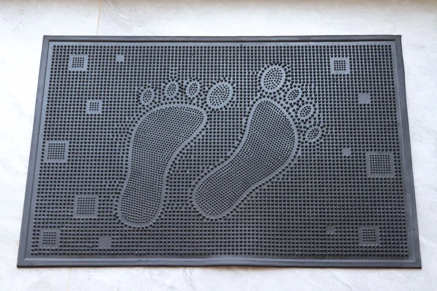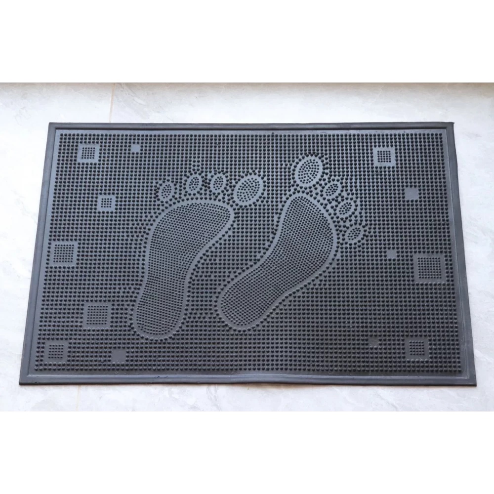 Коврик придверный резиновый с узором в виде лап. По бокам есть бортик, для задержки воды. Сделан из качественной эластичной резины, не скользит.