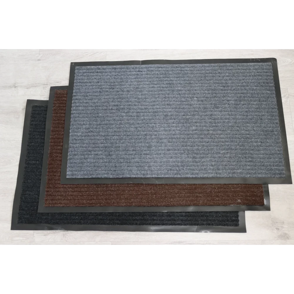 Коврик придверный в полоску рубчик 45x75 см. Это самые не дорогие и продаваемые коврики. хорошо впитывают влагу, резиновая основа не имеет насыщенного запаха. Как правило, в линейке 3 цвета - серый, коричневый и черный.
