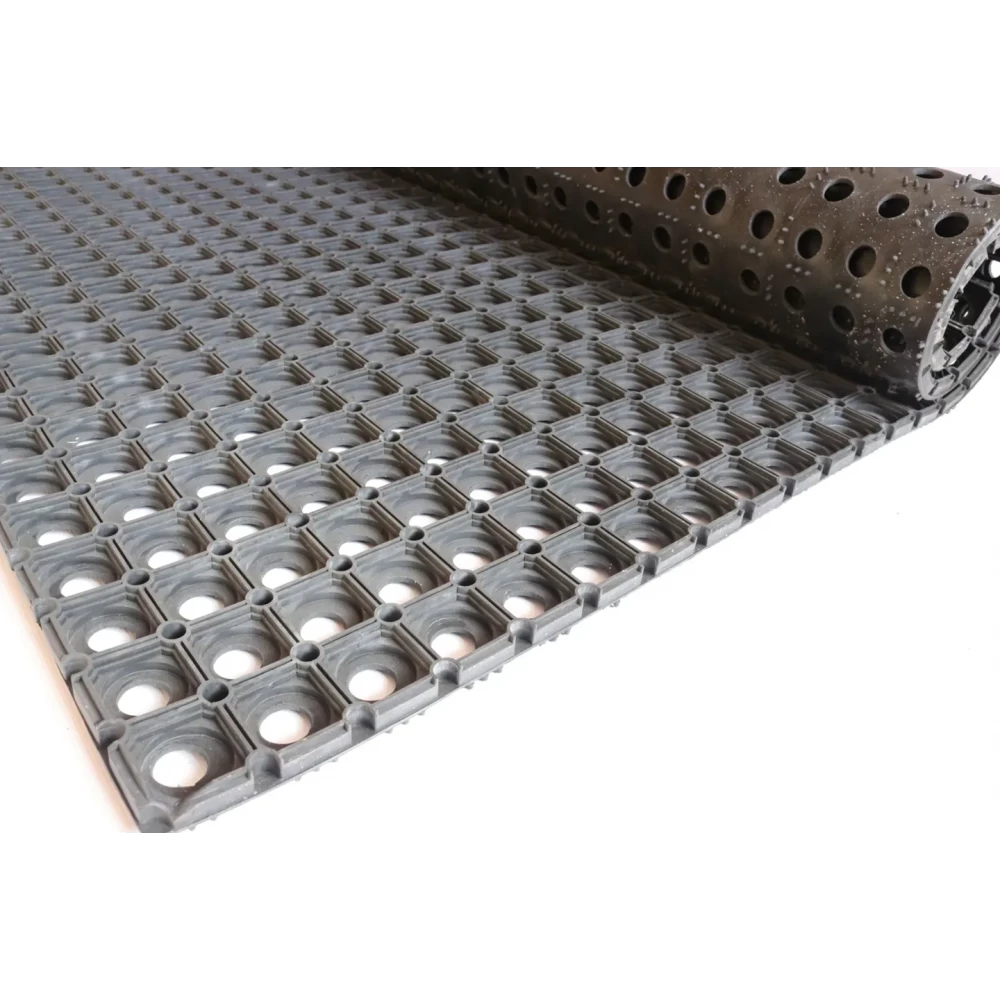 Коврик резиновый 100x150 см со сквозным рисунком в виде "сот". Предназначен для грубой очистки обуви. Шипы с нижней стороны, большой размер, а также вес в 16кг практически исключают скольжение по поверхности пола. Высококачественная резина не твердеет даже при низких температурах окружающей среды